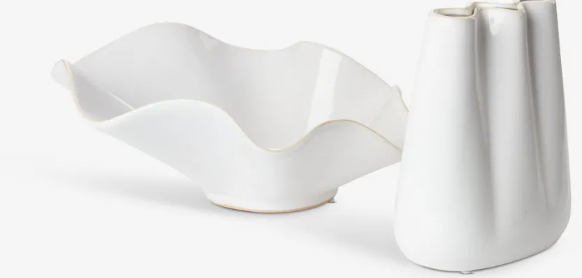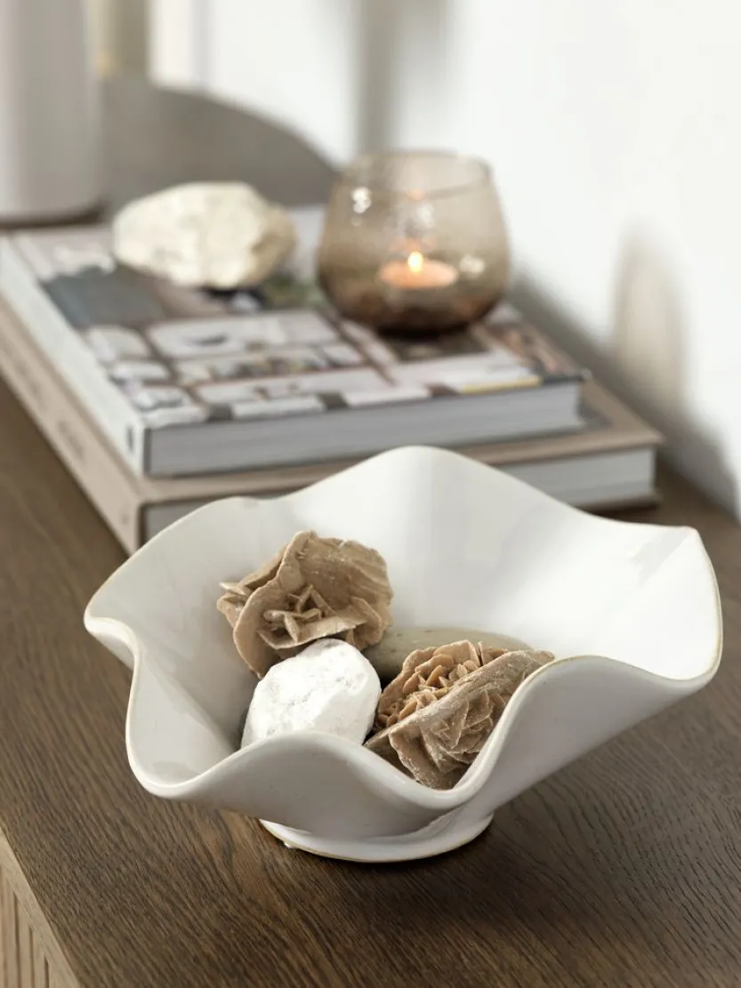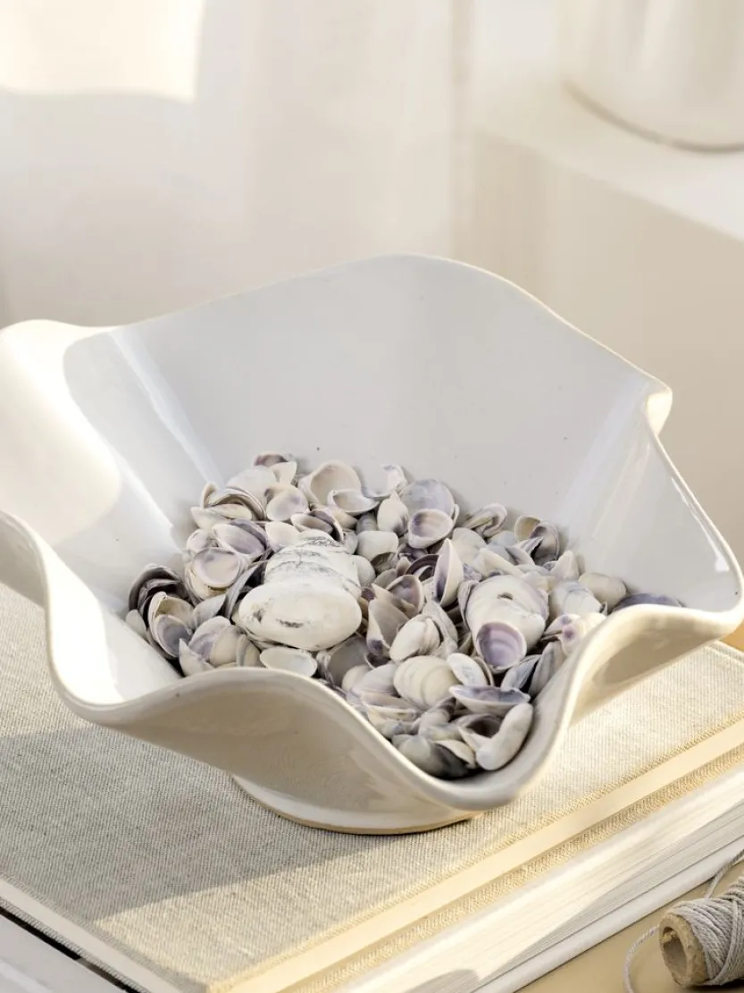 Witte decoratieve schaal van aardewerk met een golvend ontwerp. Deze schaal voegt een elegant accent toe aan elke ruimte en is geschikt voor het serveren van levensmiddelen. Geschikt voor gebruik in de vaatwasser. B27 x L23 x H10 cm.