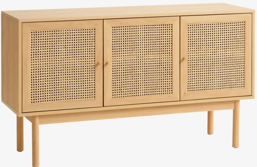 Massief hout, rotan en deco fineer. Soft-close deuren. B148 x H85 x D45 cm
