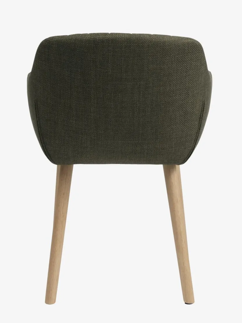 Eetkamerstoel met armleuningen die extra steun en comfort bieden. De stoel heeft een gecapitonneerde zitting en rugleuning in olijfgroene stof. Poten van massief hout.