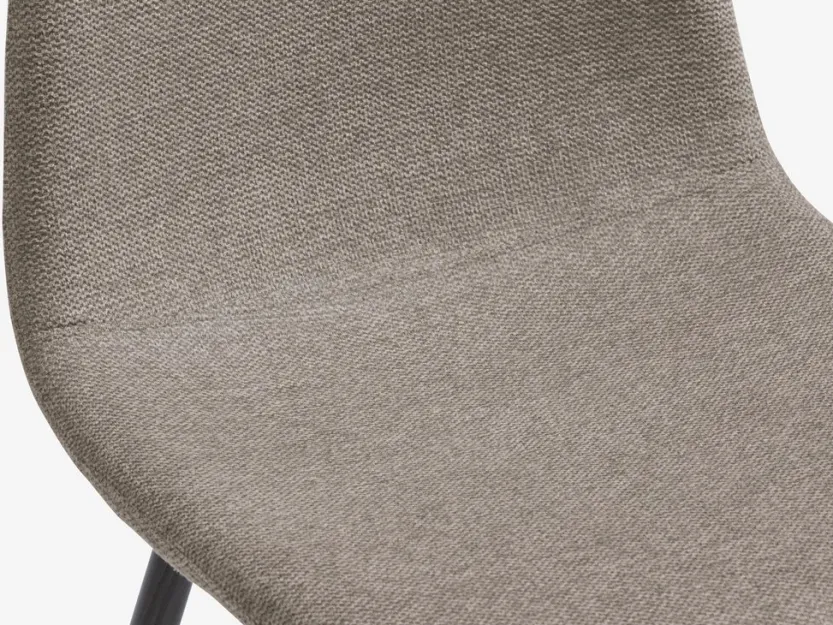 Eetkamerstoel met gecapitonneerde zitting en rugleuning in beige stof. Poten in staal met donkere eiken look.