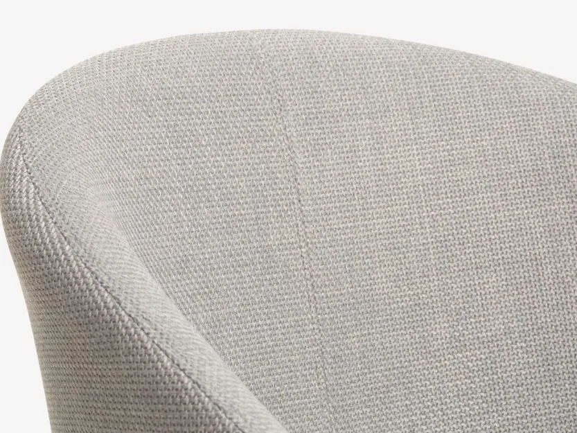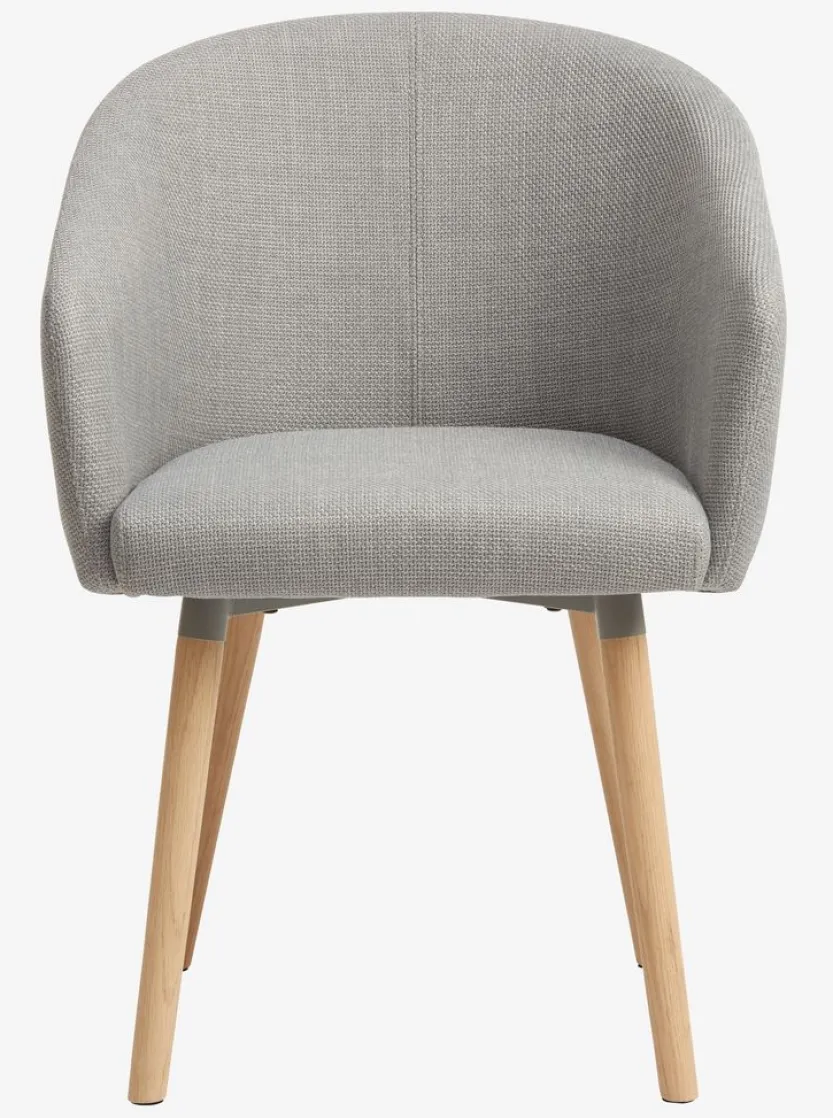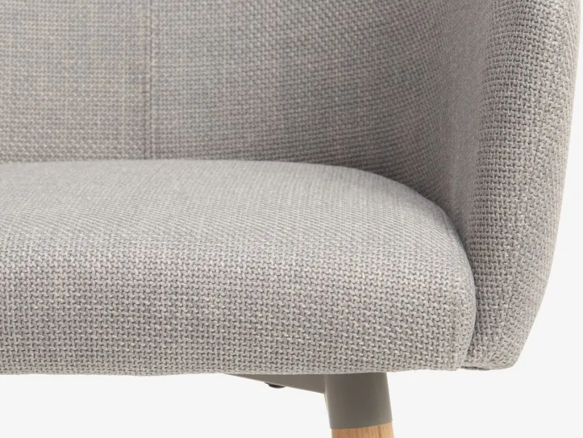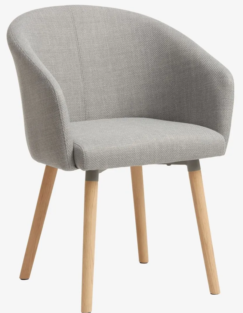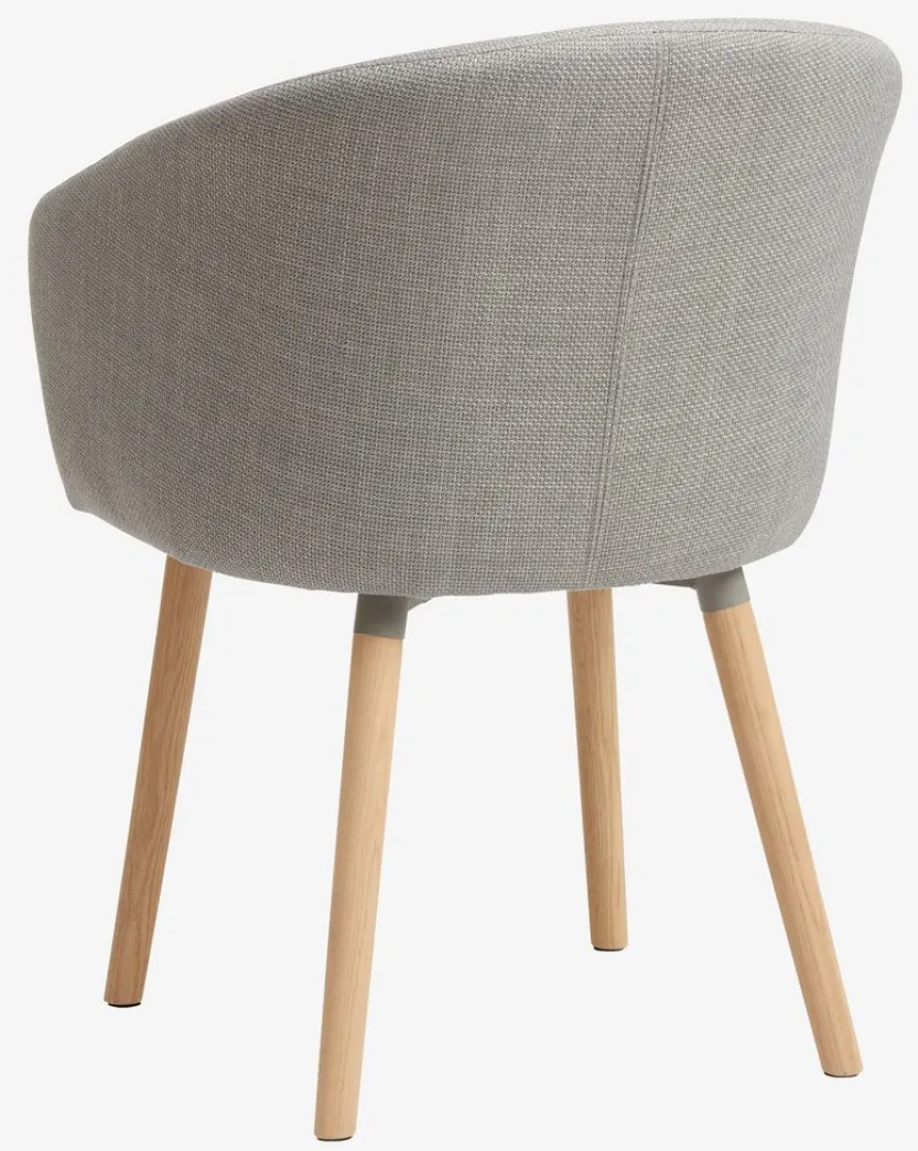 Eetkamerstoel met armleuningen die extra ondersteuning en comfort bieden. De stoel heeft een gecapitonneerde zitting en een gebogen rugleuning in lichtgrijze stof. Poten in massief eiken.