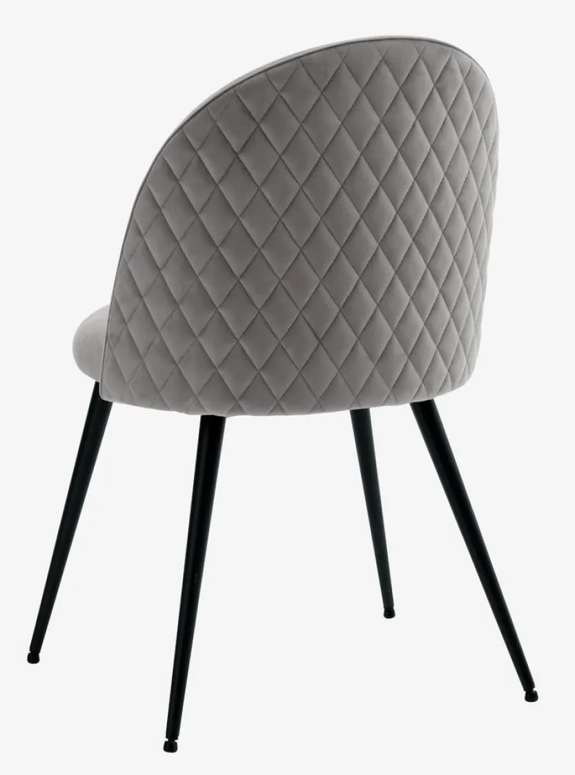 Eetkamerstoel met gecapitonneerde zitting en rugleuning in grijs fluwelen stof. Zwarte poten van staal.