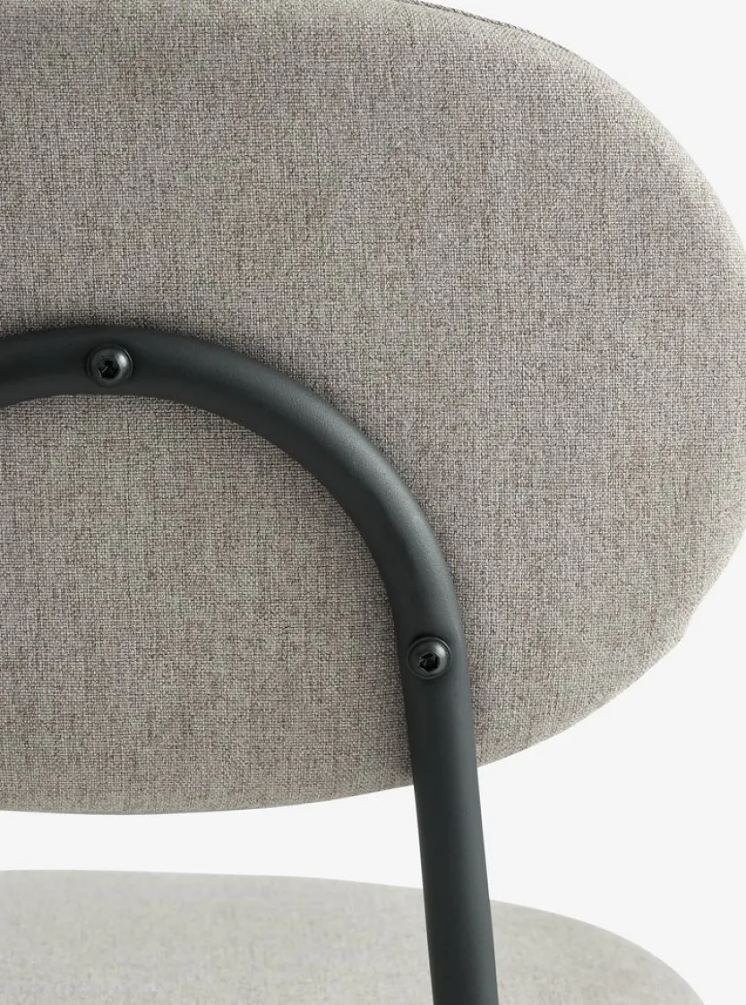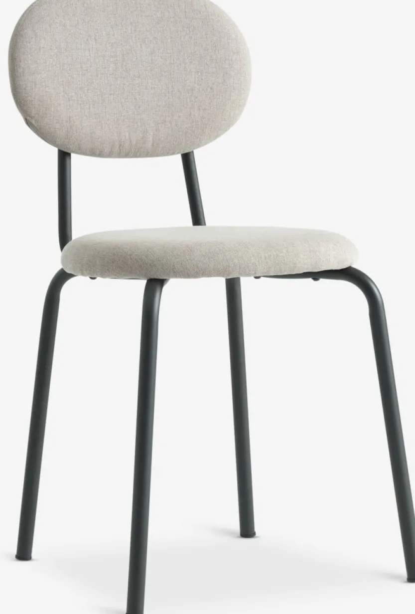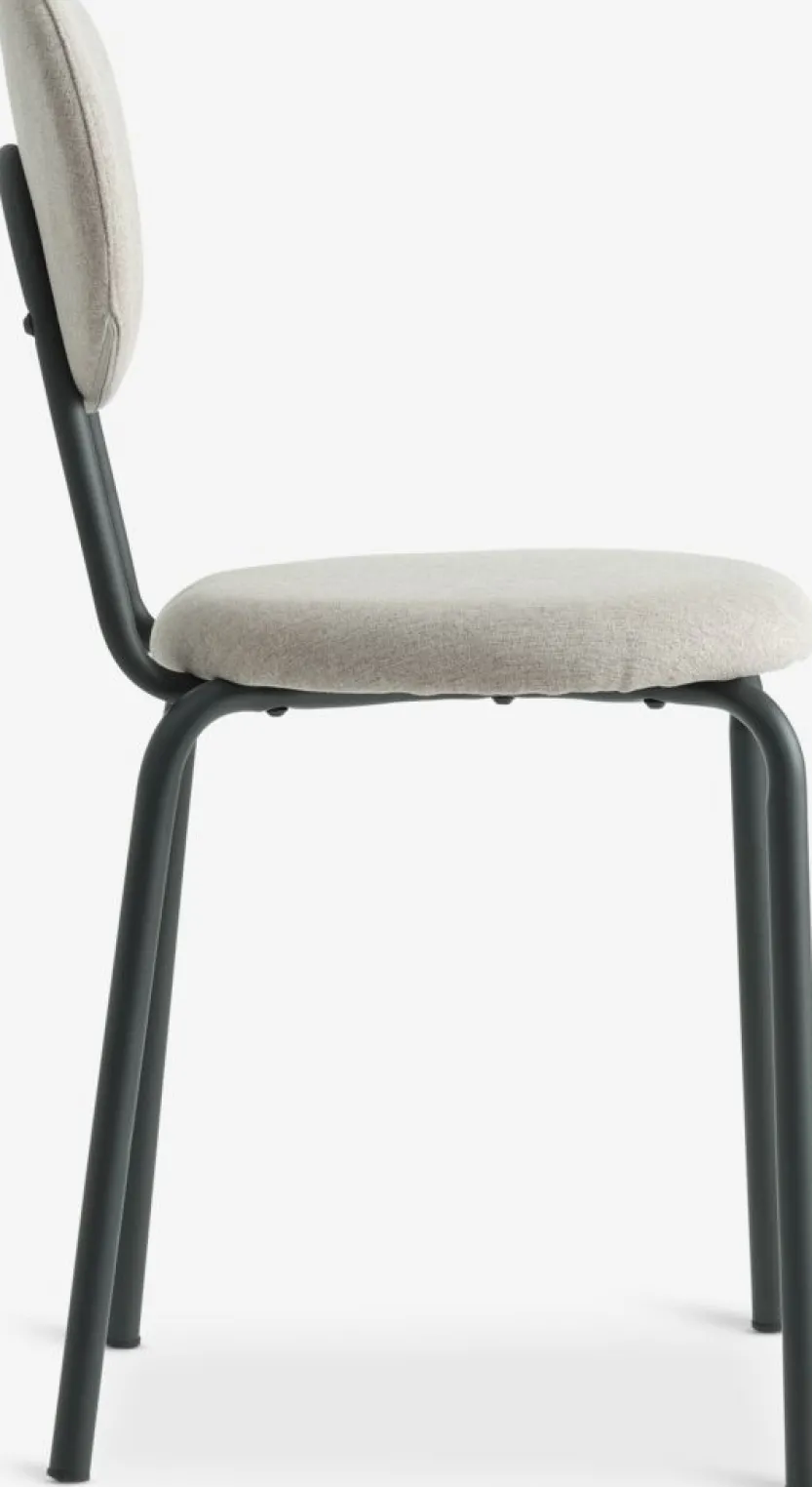 Eetkamerstoel met gecapitonneerde zitting en rugleuning in zandkleurige stof. Zwarte poten van staal.