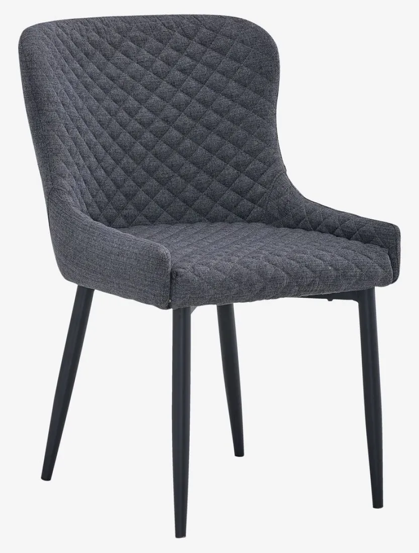 Eetkamerstoel met gecapitonneerde zitting en rugleuning in grijze stof. Zwarte poten van staal.