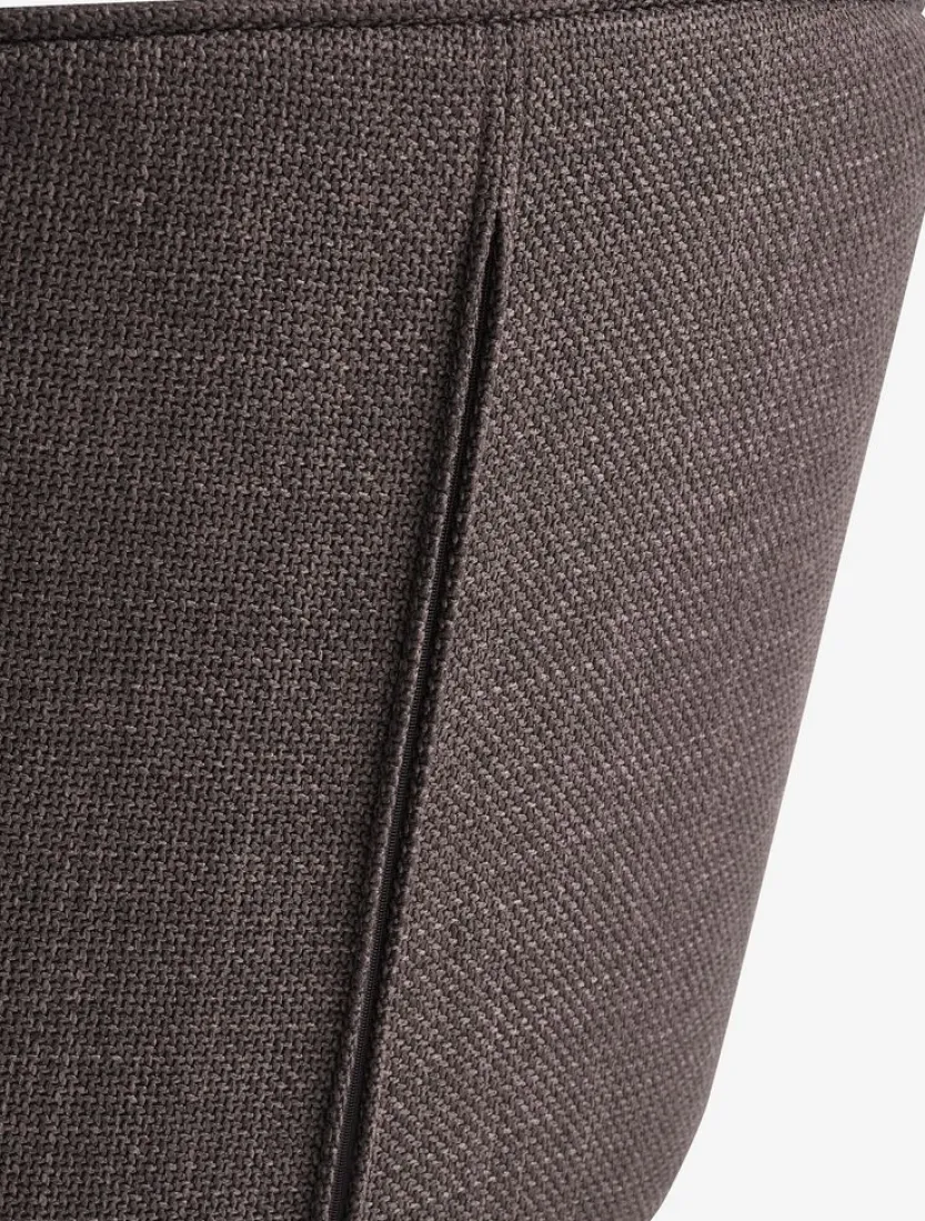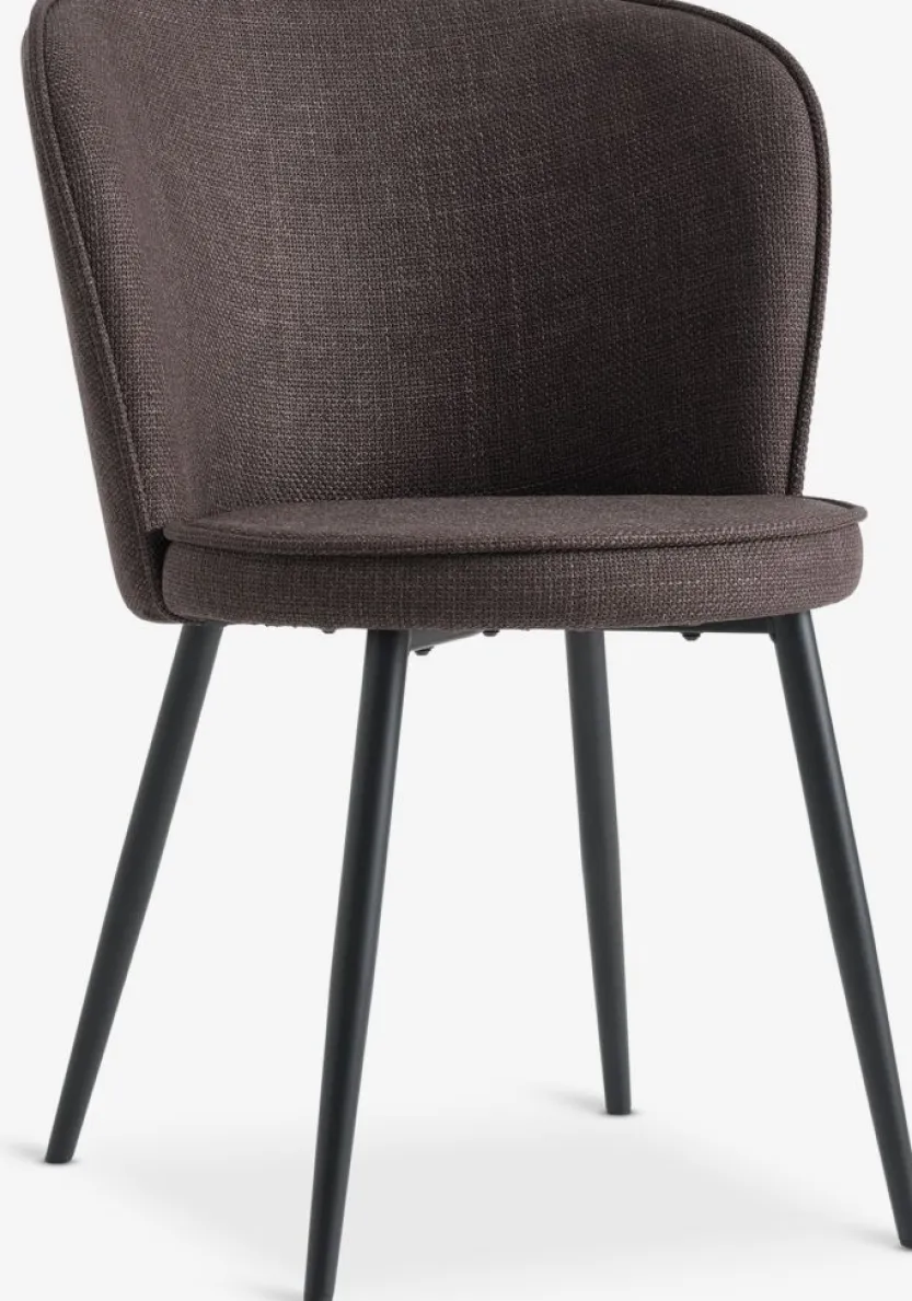Eetkamerstoel met gecapitonneerde zitting en gebogen rugleuning in donkerbruine stof. Zwarte poten van staal.