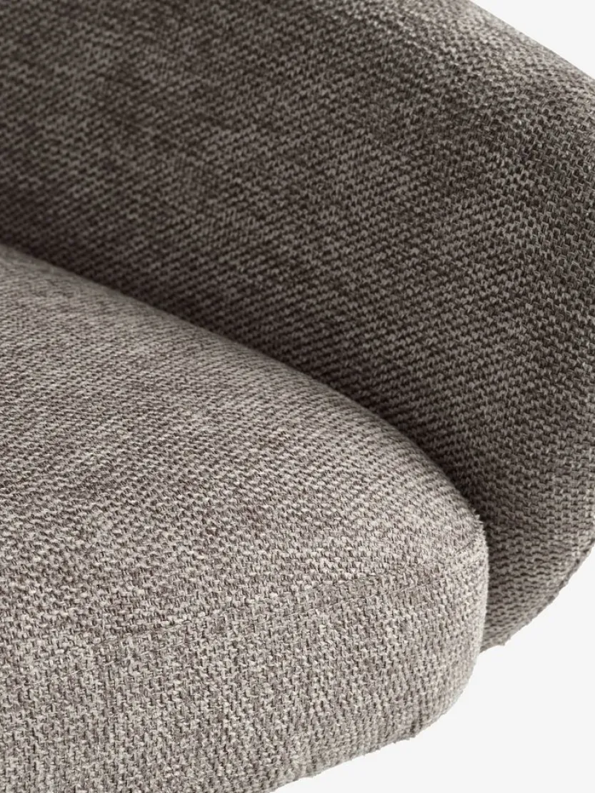 Eetkamerstoel met armleuningen die extra steun en comfort bieden. De stoel heeft een gevoerde zitting en rugleuning in beige stof. Zwarte draaivoet van staal, waardoor de stoel gemakkelijk kan draaien.