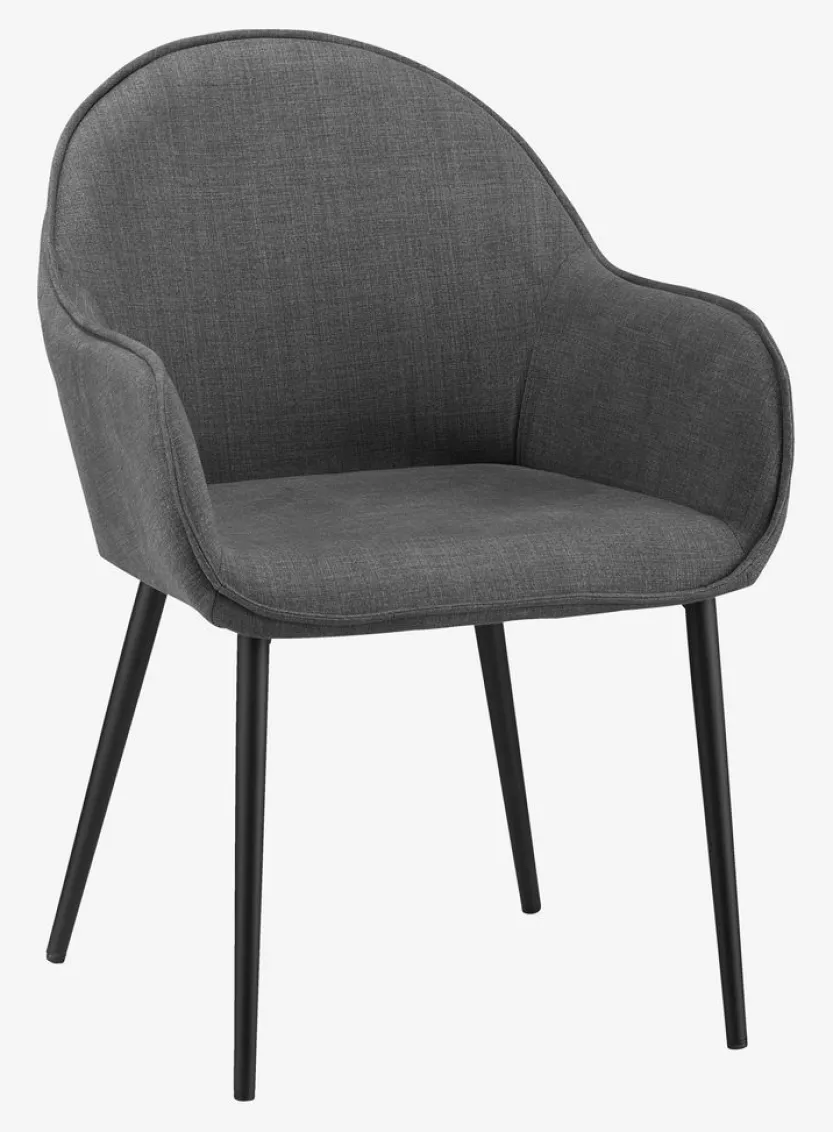 Eetkamerstoel met armleuningen die extra ondersteuning en comfort bieden. De stoel heeft een gecapitonneerde zitting en rugleuning in grijze stof. Zwarte poten van staal.