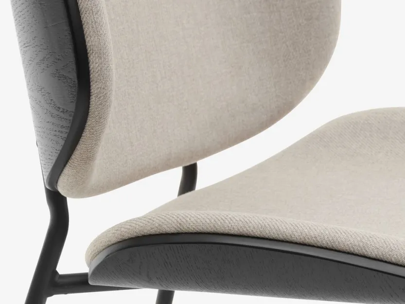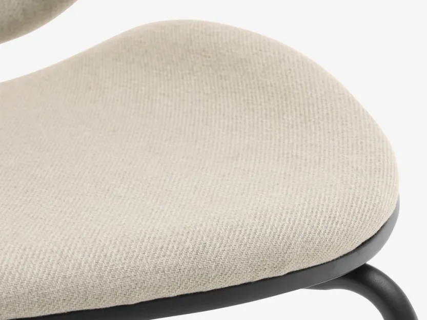 Eetkamerstoel met gecapitonneerde zitting en rugleuning in een lichte zandkleur. Zwarte poten van staal.