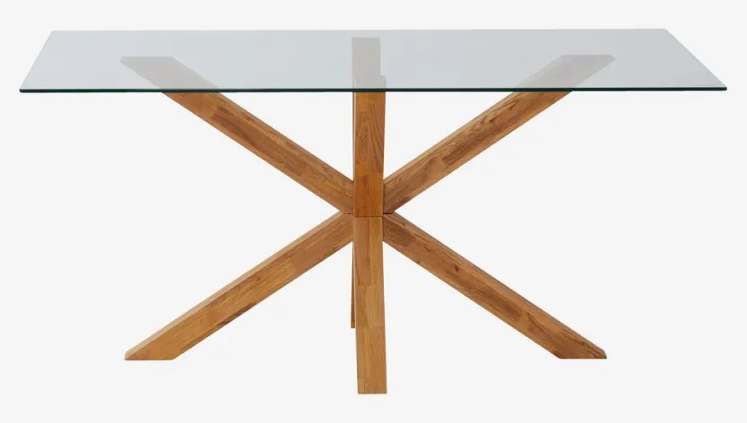 Eettafel met een tafelblad van gehard glas en poten van massief eiken. Het hout is behandeld met olie om het te beschermen en de natuurlijke kleur te benadrukken. B90 x L160 x H75 cm