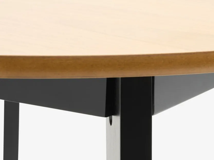 Ronde eettafel met een tafelblad van eiken fineer en zwarte poten van massief hout. Het hout is gelakt voor een langere levensduur. Ø105 x H75 cm