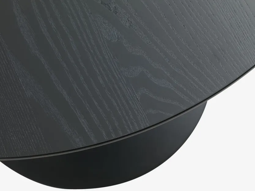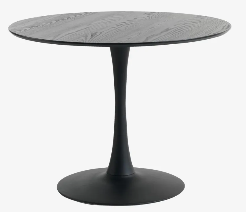 Ronde eettafel met een zwart tafelblad in essen fineer en een bijpassend onderstel in staal. Het tafelblad is gelakt voor een langere levensduur. Ø100 x H75 cm