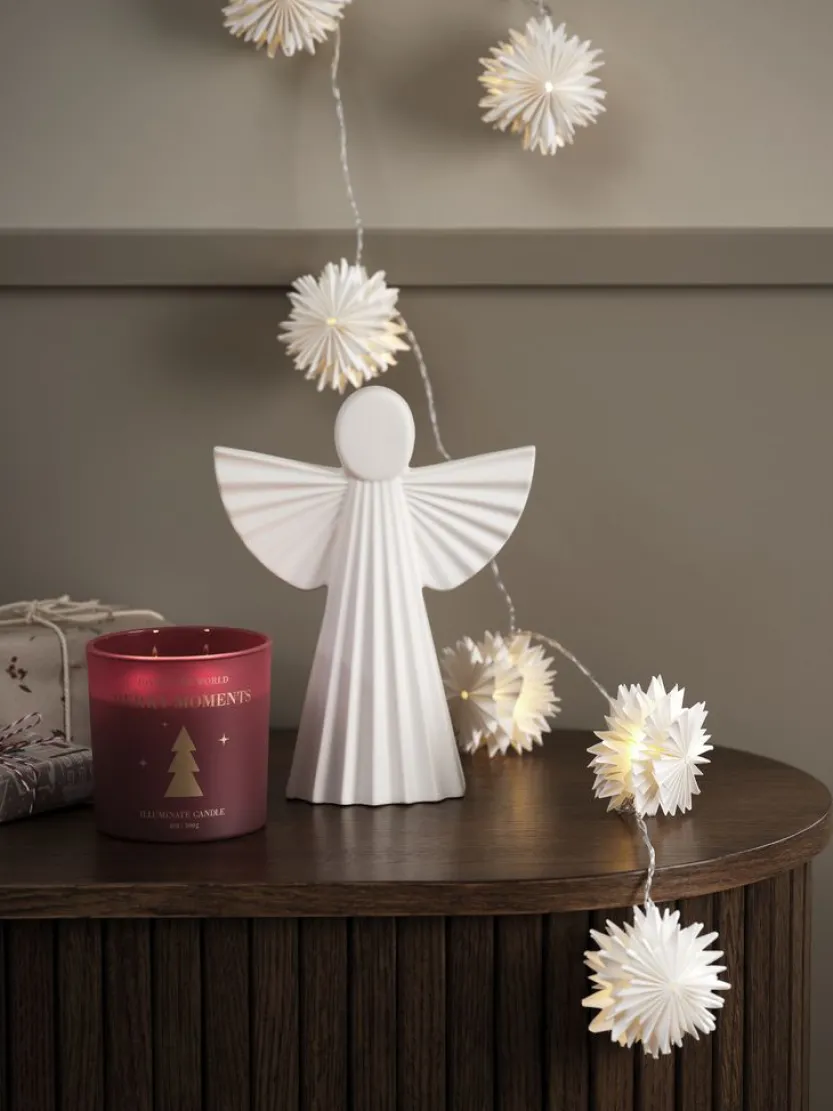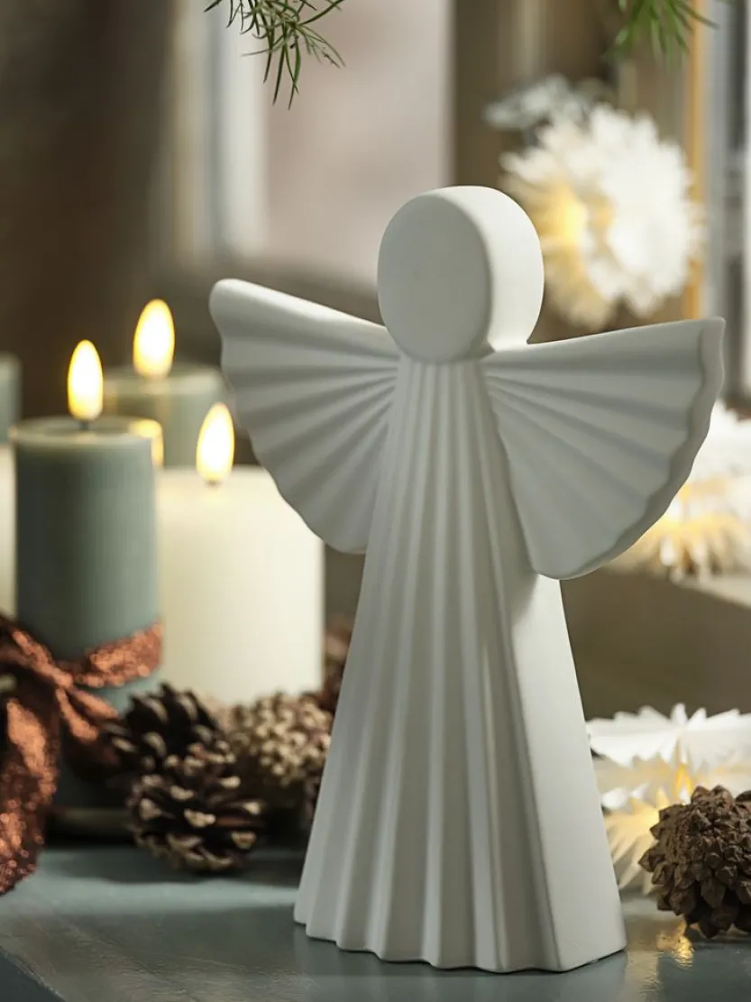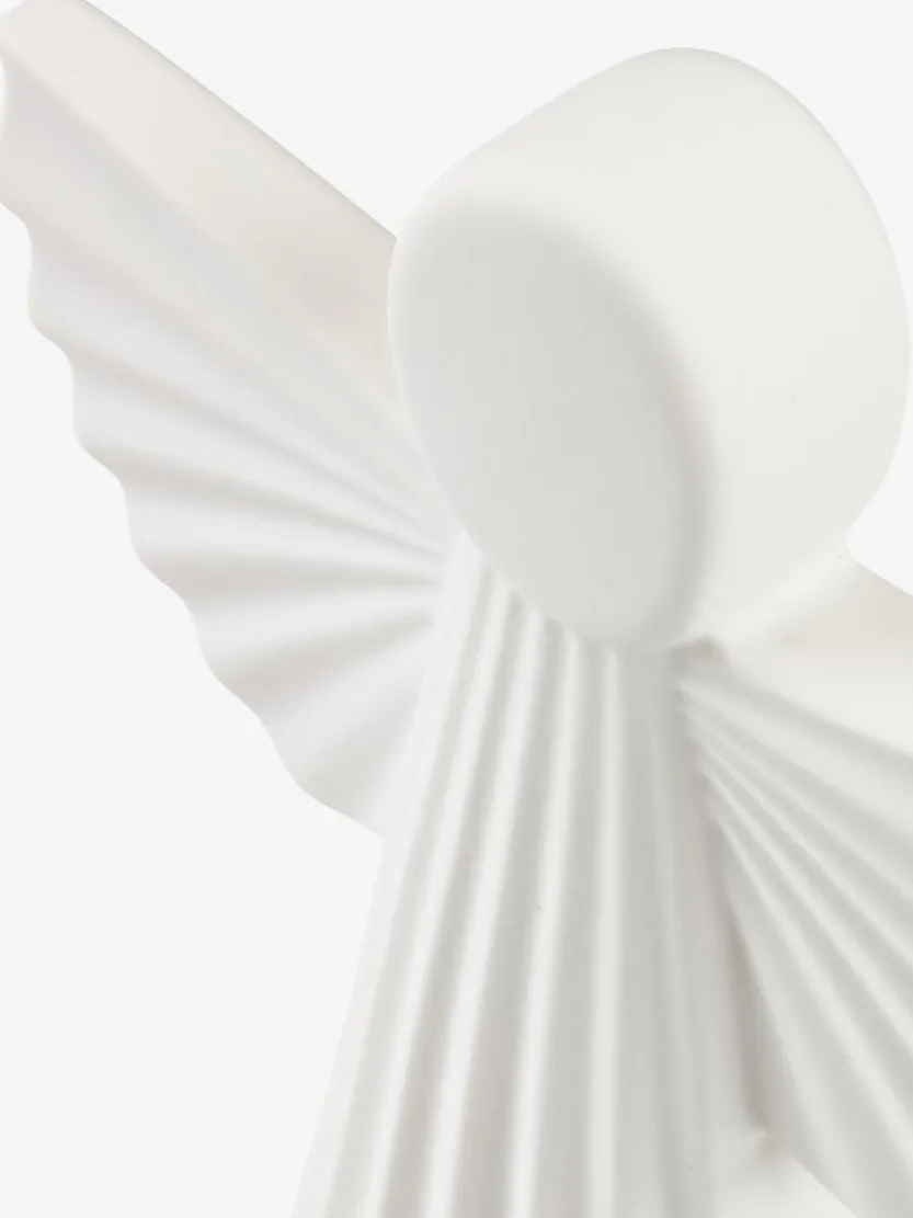 Witte engel met gedetailleerde vleugels en een geribbelde mantel. Het ontwerp straalt eenvoud en elegantie uit, perfect voor kerstdecoraties of als een tijdloos decoratief stuk in je huis. Deze engel kan gemakkelijk worden geplaatst op tafels, schoorstenen of boekenplanken om een serene sfeer te creëren. B18 x L8 x H23 cm.