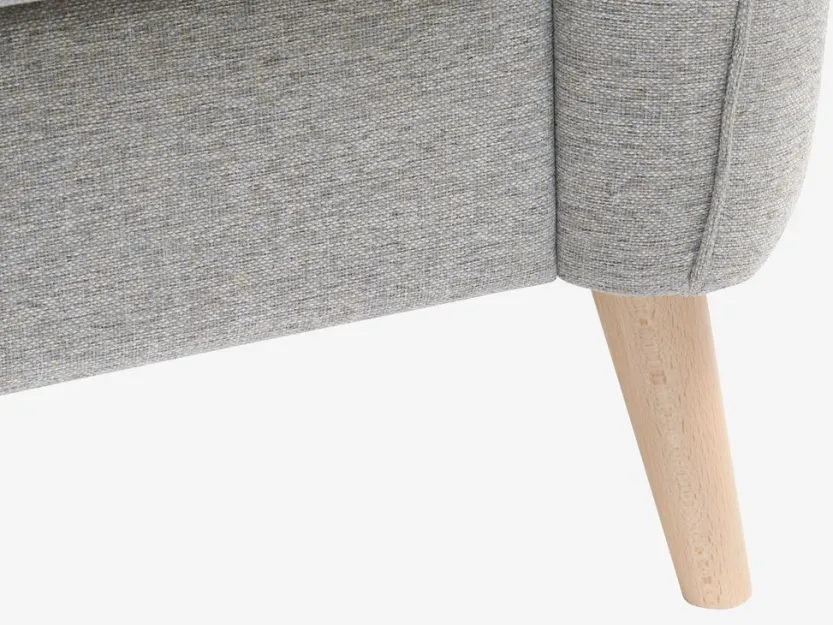 Stof. Zit en kussens van schuim. Poten van massief beuken. B94 x H82 x D84 cm