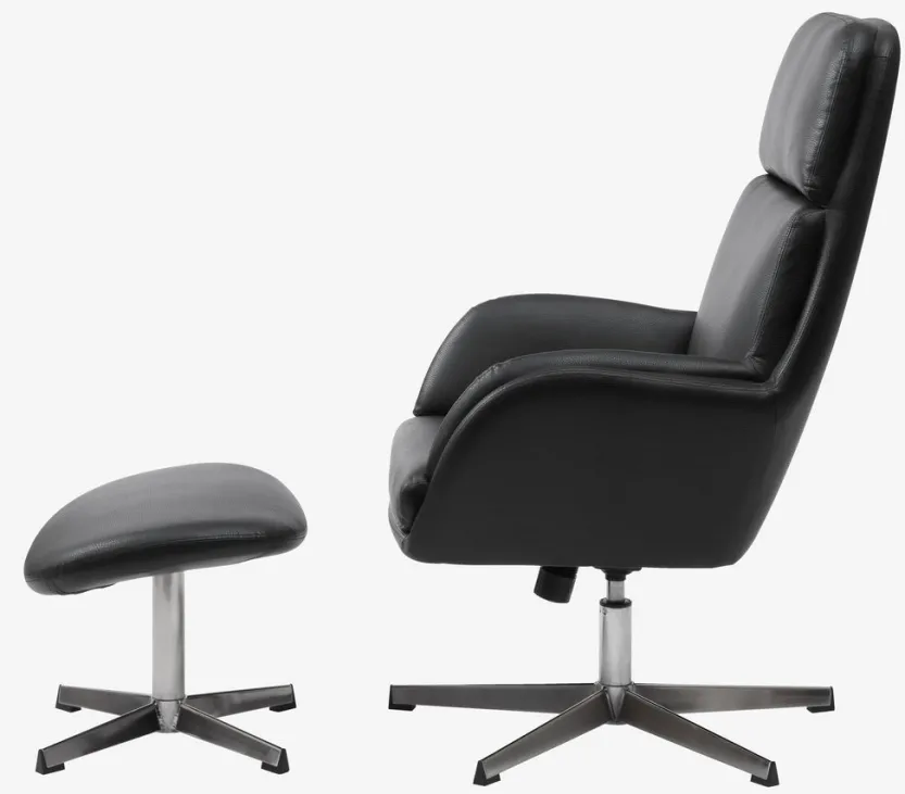 Kunstleer. Zit- en rugkussens in schuim. Met draaivoet in chroom en traploos kantelmechanisme. Incl. voetenbankje. B70 x H107 x D119 cm