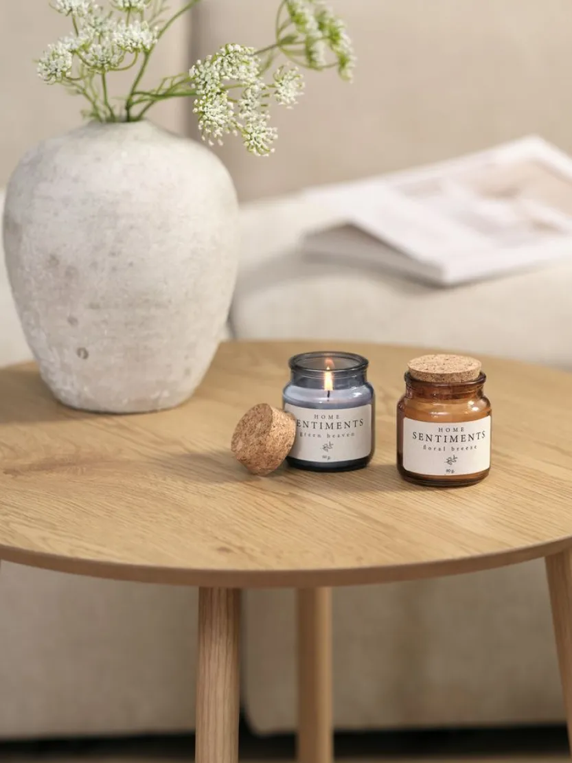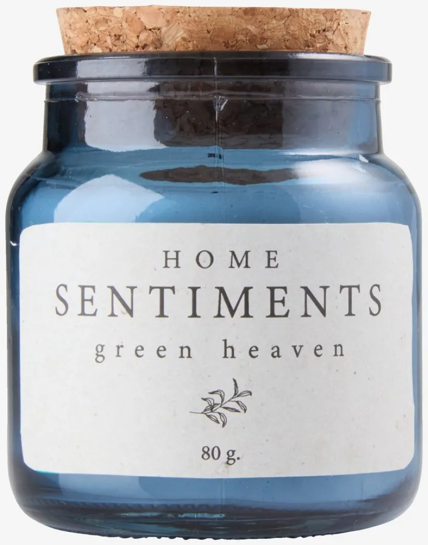 Geurkaars in een elegante glazen pot met een kurken deksel. Elke kaars verspreidt een aangename geur en heeft een brandtijd van 20-24 uur. Ideaal voor het creëren van een gezellige sfeer in elke ruimte. Beschikbaar in oud blauw en latte. Ø6 x H8 cm