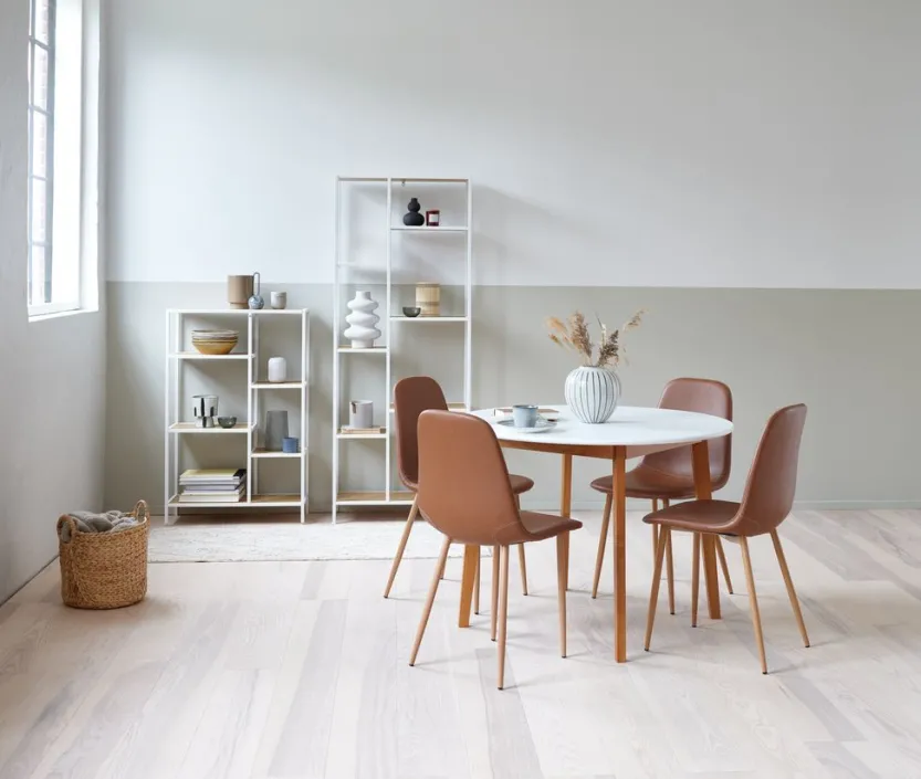 JEGIND Ø105 tafel wit + 4 JONSTRUP cognac/eiken