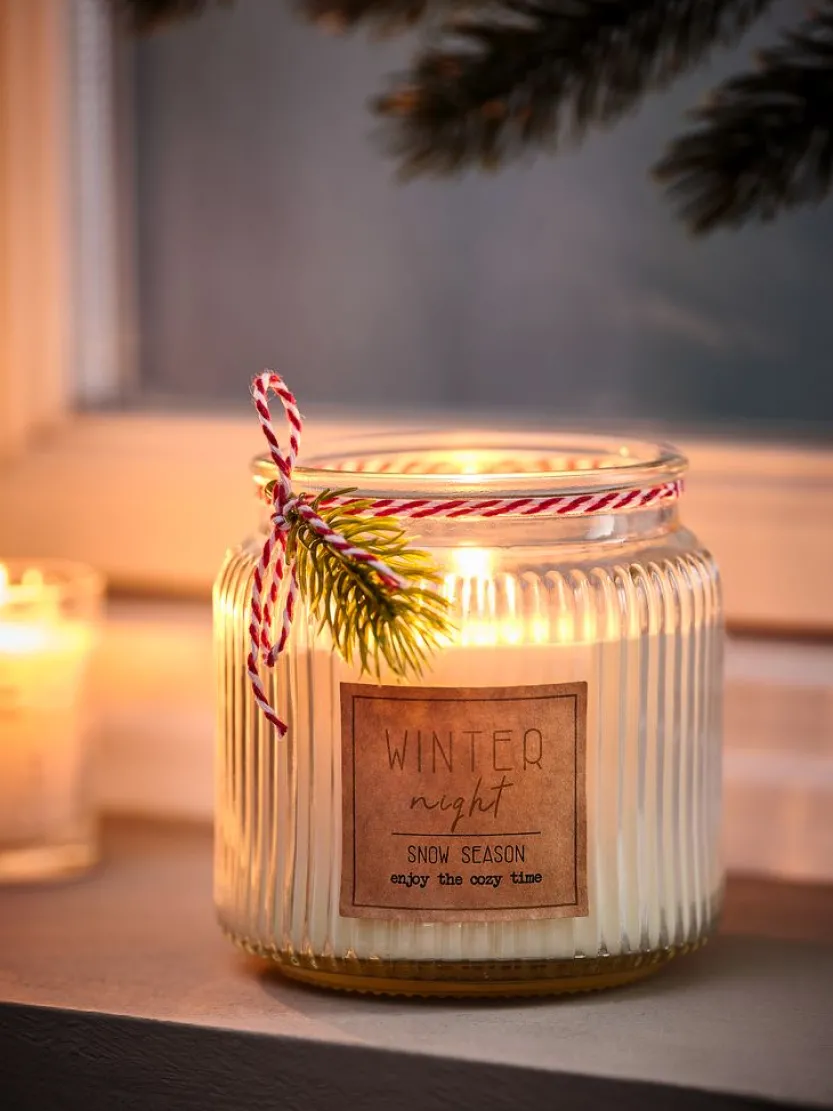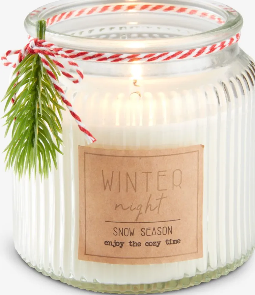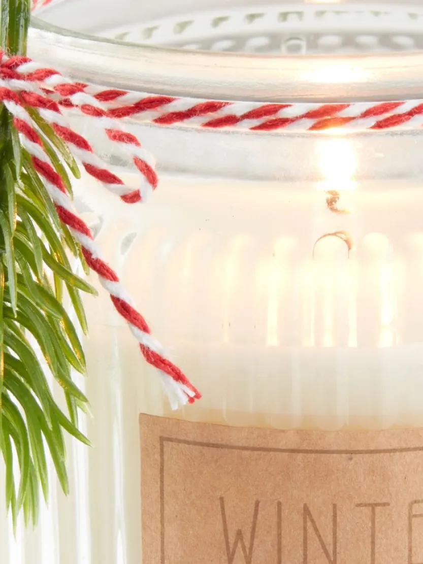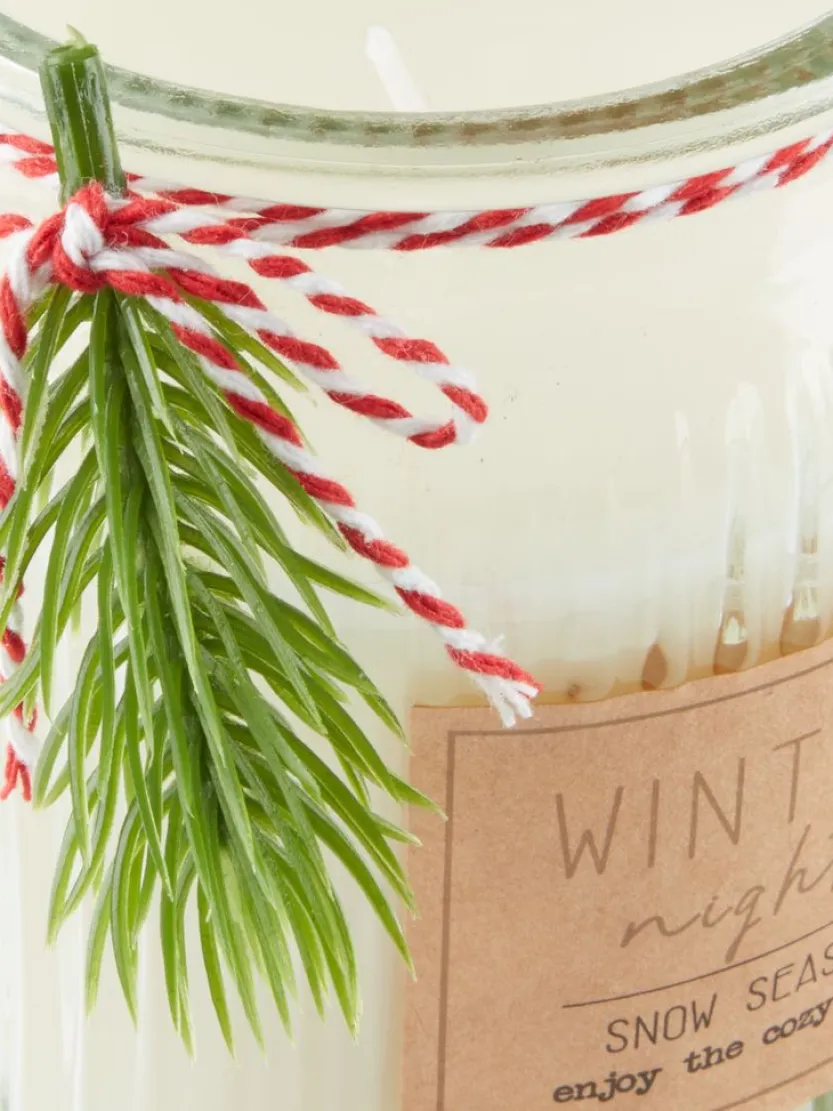 Witte kaars in een glazen houder met geribbeld ontwerp. De kaars is versierd met een rood-wit touwtje en een klein groen takje, wat een feestelijk accent toevoegt. De kaars heeft een brandduur van 40 uren en een gladde textuur. Perfect om tijdens de feestdagen een gezellige sfeer te creëren. Ø10 x H10 cm
