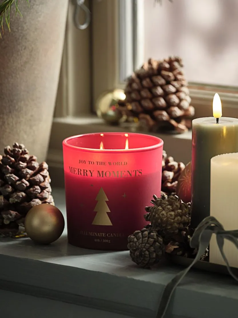 Rode kaars met een gladde afwerking en een feestelijke opdruk. De kaars heeft een brandduur van 40 uren en is perfect voor het creëren van een warme kerstsfeer. Ø10 x H10 cm.