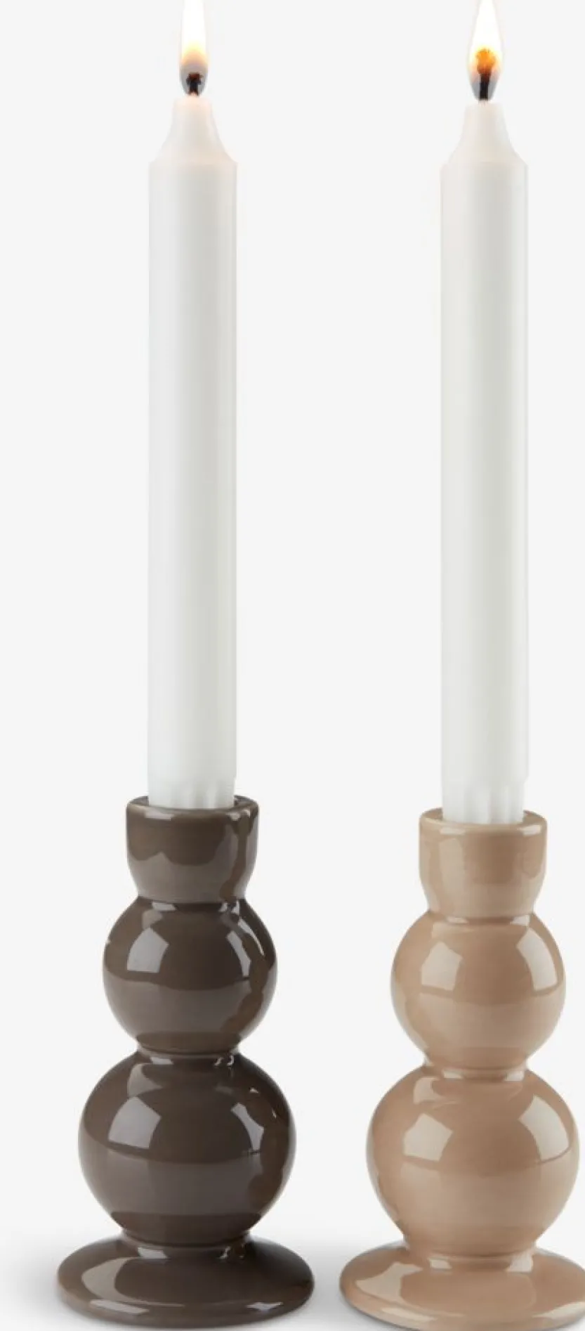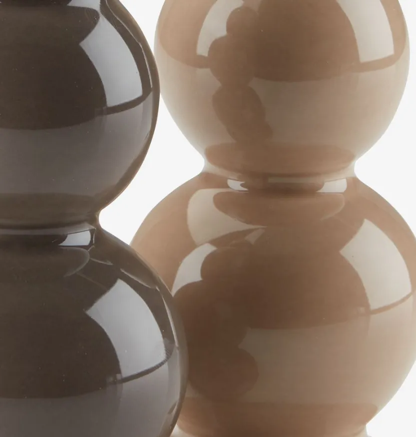 Set van twee kandelaars van dolomiet, in bruin en zandkleur. Deze kandelaars hebben een uniek, bolvormig ontwerp dat een moderne en elegante uitstraling geeft aan elk interieur. Ideaal voor het plaatsen van kaarsen in verschillende ruimtes van je huis. Ø7 x H13 cm.