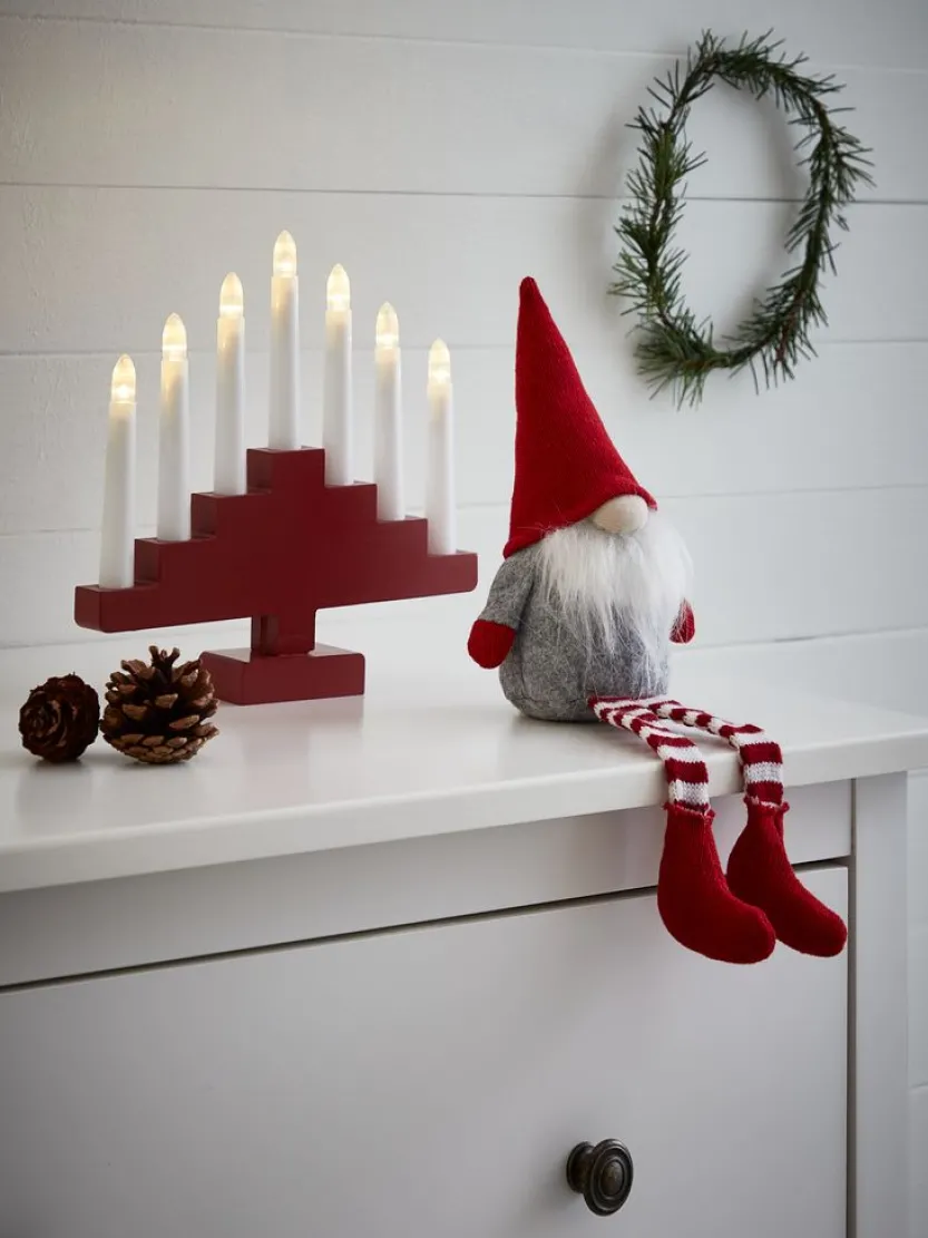 Rode kandelaar met zeven witte LED-kaarsen die een warme gloed uitstralen en zorgen voor een gezellige kerstsfeer. De lamp werkt op batterijen en heeft een handige timer functie, waardoor hij automatisch 6 uur aan en 18 uur uit gaat. Batterijen zijn niet inbegrepen. B24 x L5 x H23 cm