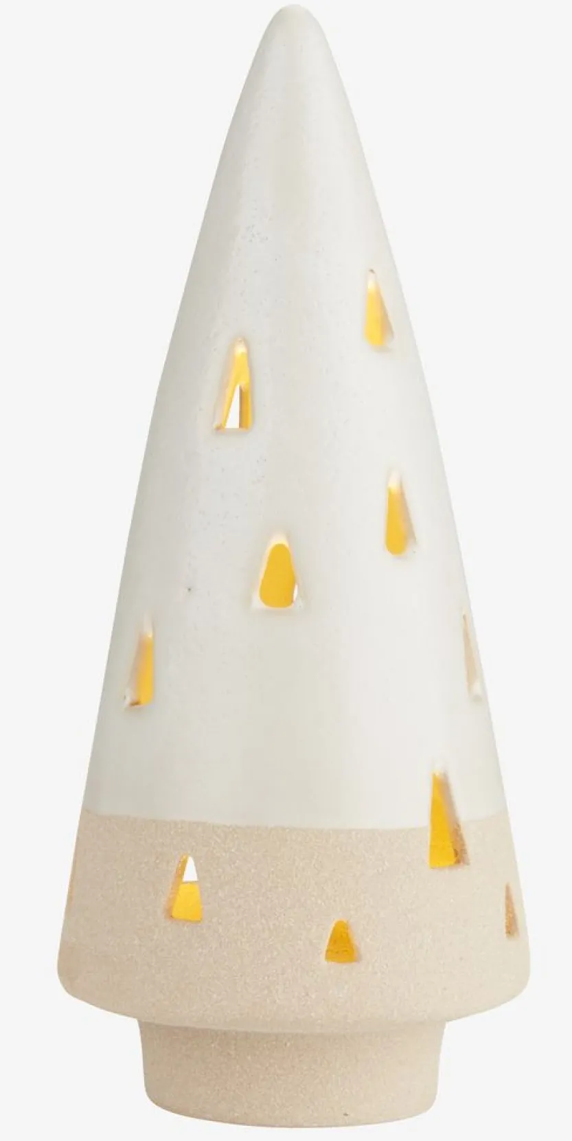 Witte kerstboom met subtiele uitsparingen voor een sfeervolle verlichting. De ingebouwde LED-lamp zorgt voor een zacht en warm licht, ideaal voor een knusse kerstsfeer binnenshuis. Werkt op een CR2032 batterij (niet inbegrepen). Ø9 x H21 cm