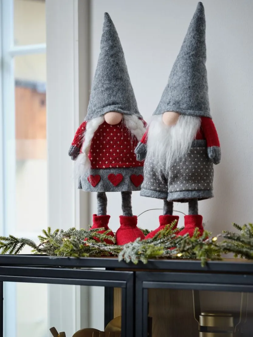 Set van twee kerstelfen in grijs en rood. Deze charmante figuren hebben een speels ontwerp met lange puntmutsen en grote rode schoenen. De ene elf draagt een rode trui met stippen en een grijze broek met hartjes, terwijl de andere een grijze trui met stippen en een rode broek draagt. Beide elfen hebben witte baarden en een gezellige uitstraling, perfect voor het creëren van een feestelijke sfeer in huis. H43 cm