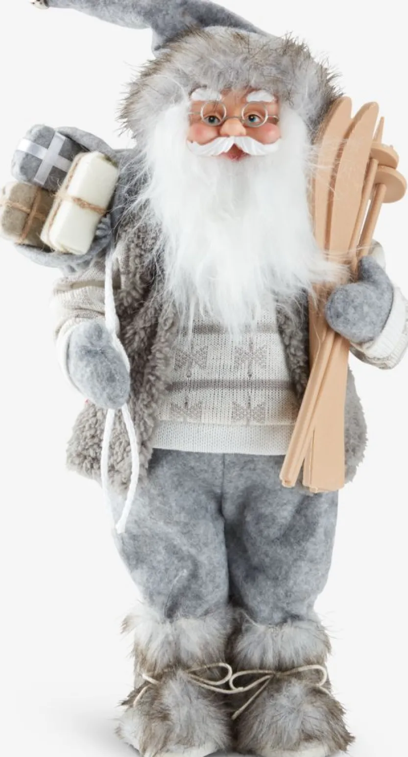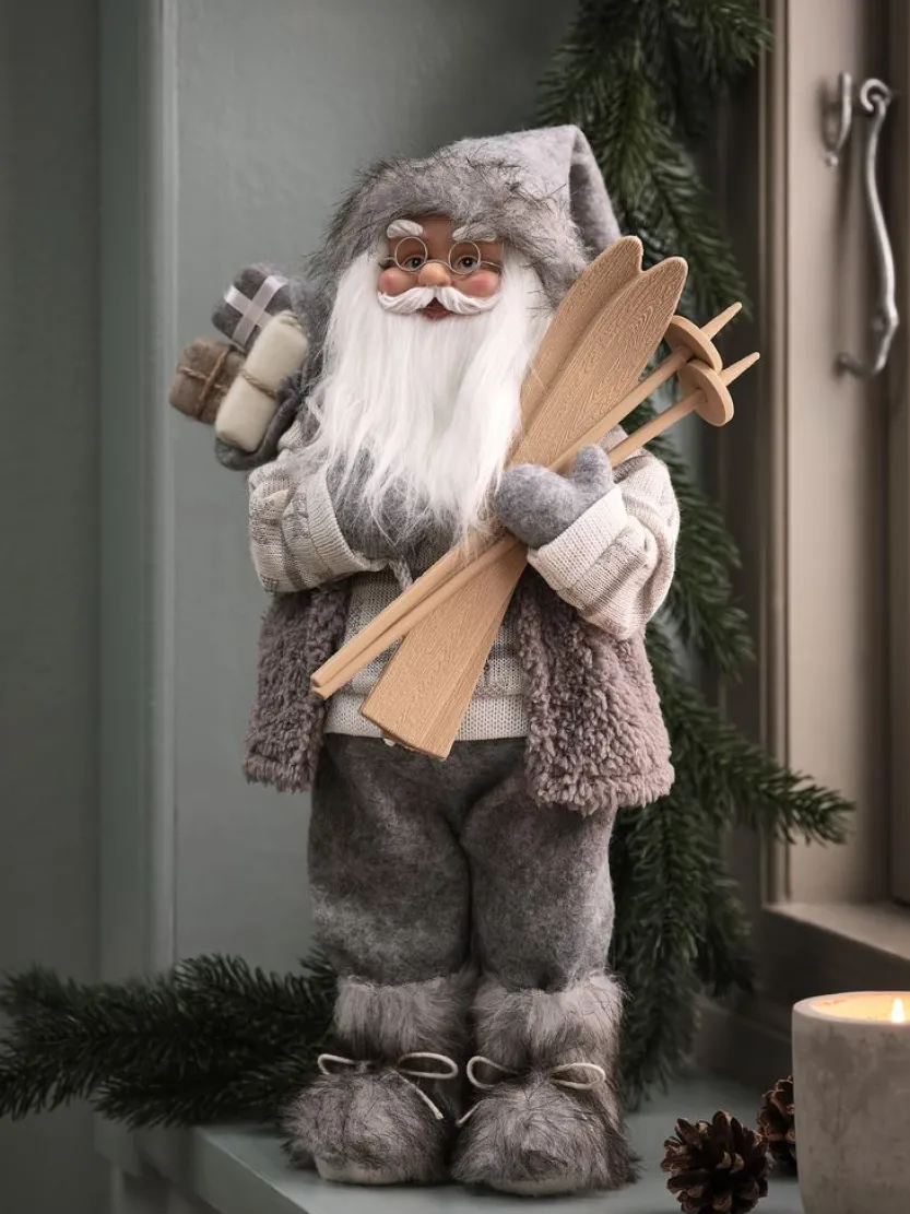 Grijze en witte kerstman met een moderne uitstraling. Deze decoratieve kerstman heeft een zachte baard en draagt een muts, een trui, en een jas. Hij heeft een cadeau en een paar houten ski’s in zijn hand, wat hem een avontuurlijk en feestelijk karakter geeft. Perfect voor binnenshuis decoratie tijdens de feestdagen. B24 x L15 x H41 cm.