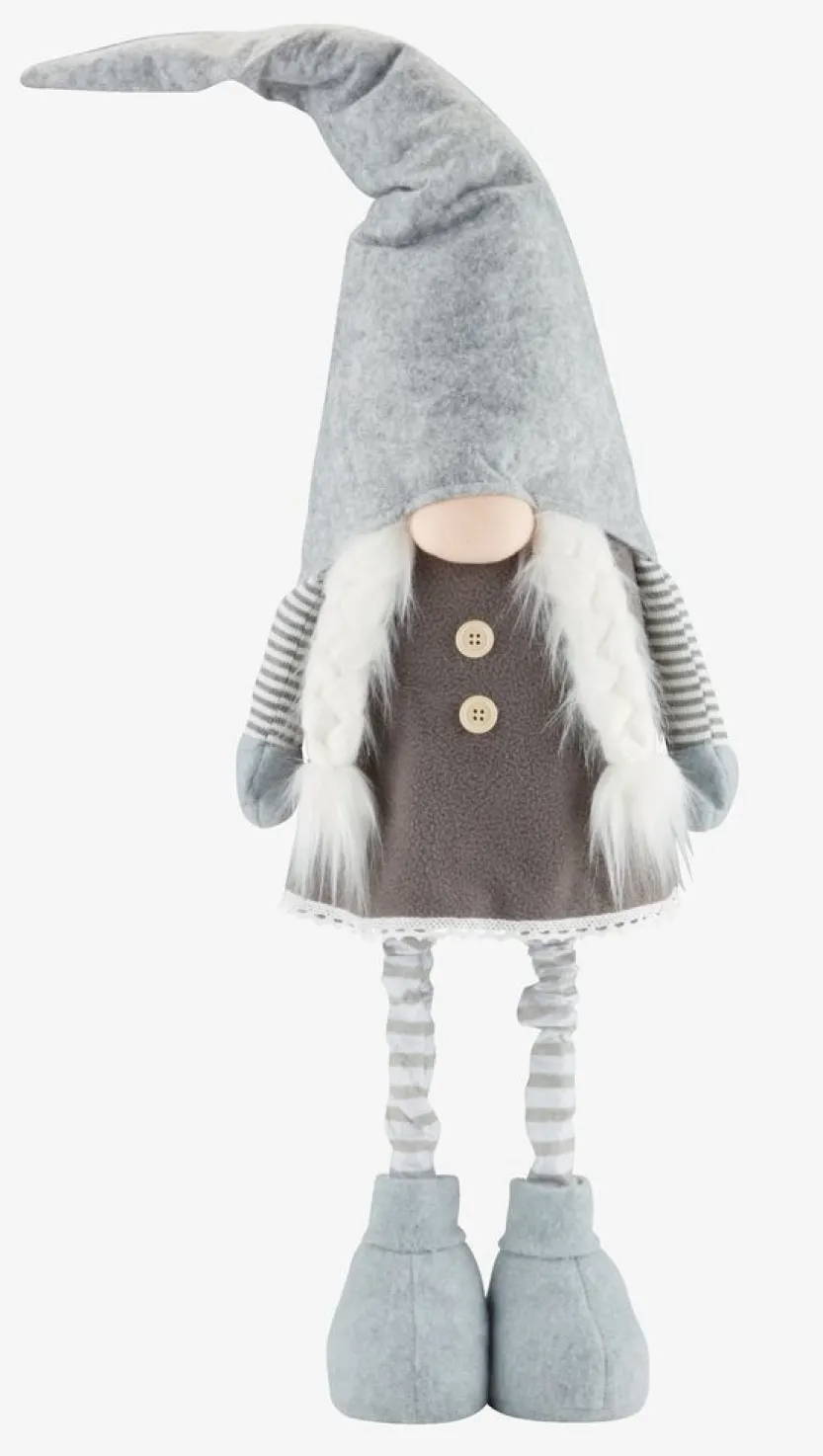 Grijze kerstelf met een speels ontwerp en lange puntmuts. Deze decoratieve kerstelf heeft gedetailleerde accenten zoals gestreepte armen en benen, grote knopen, en een wollige baard. Perfect om een gezellige kerstsfeer in huis te brengen. B18 x L19 x H115 cm.