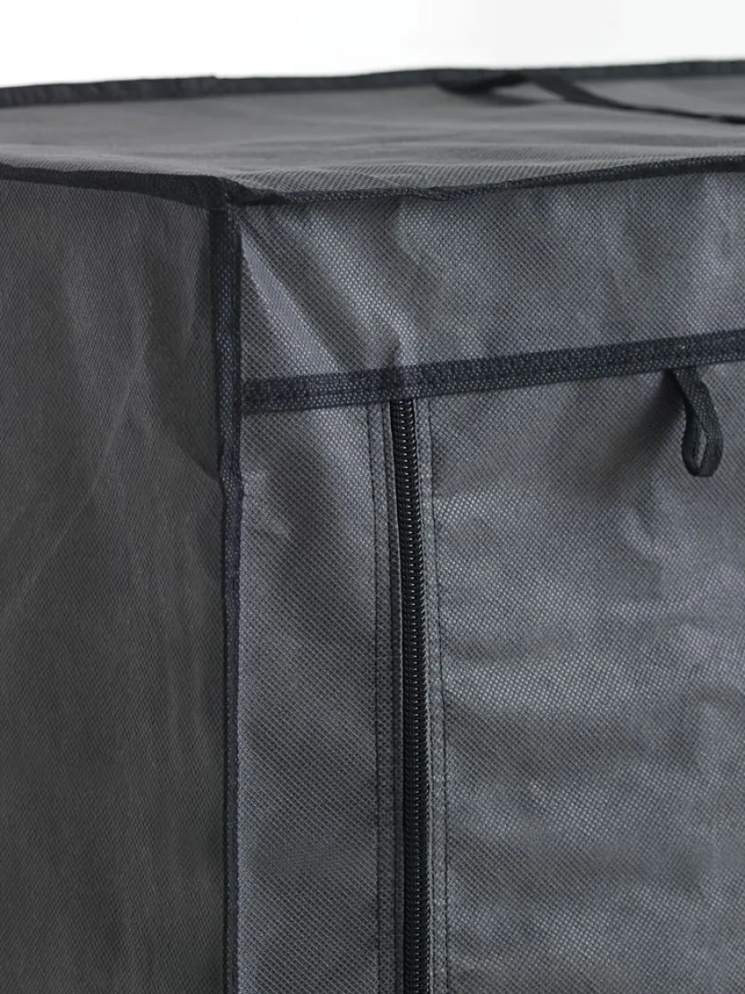 Staal en stof. Kastindeling: 4 schappen en 1 kledingroede. B100 x H174 x D46 cm