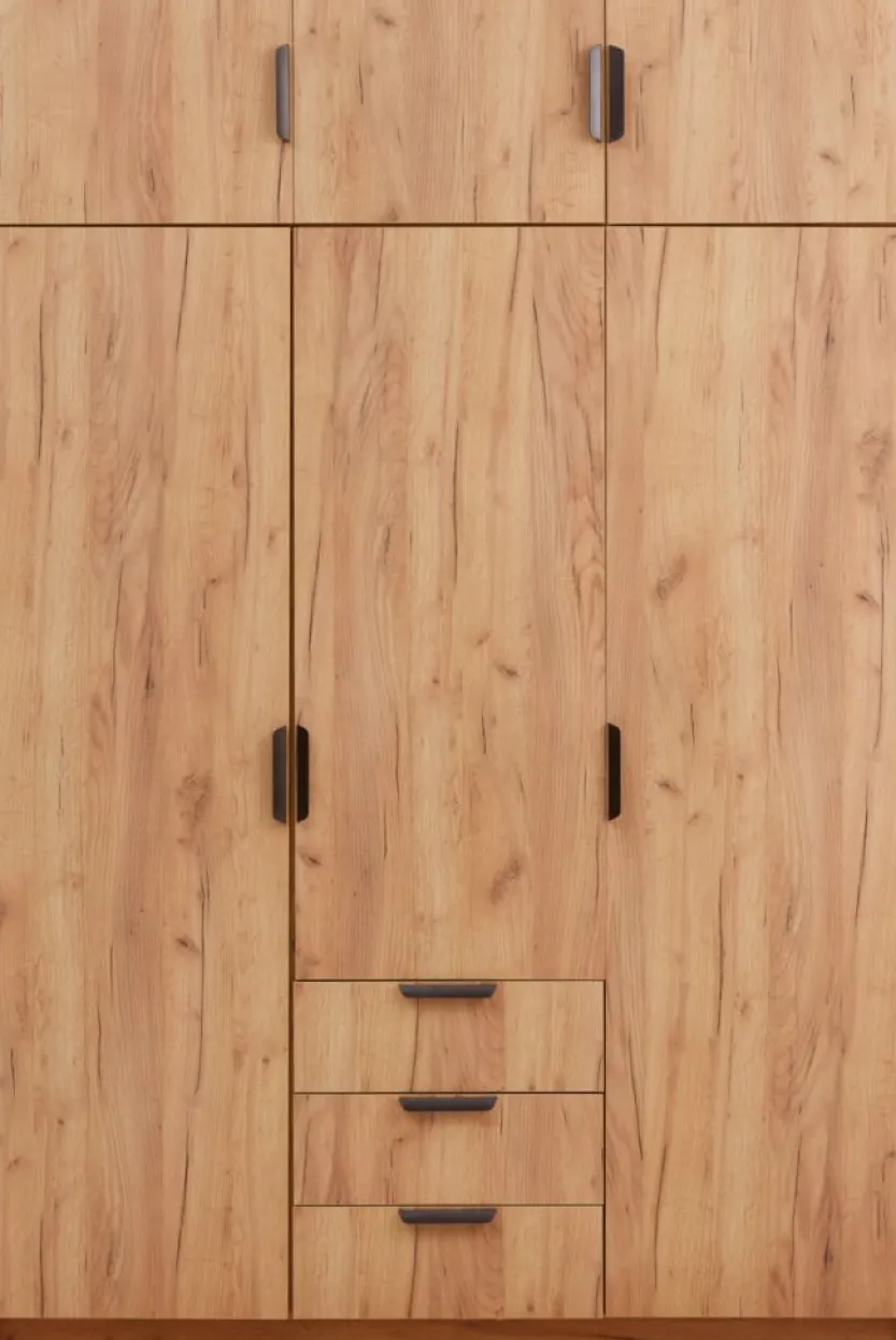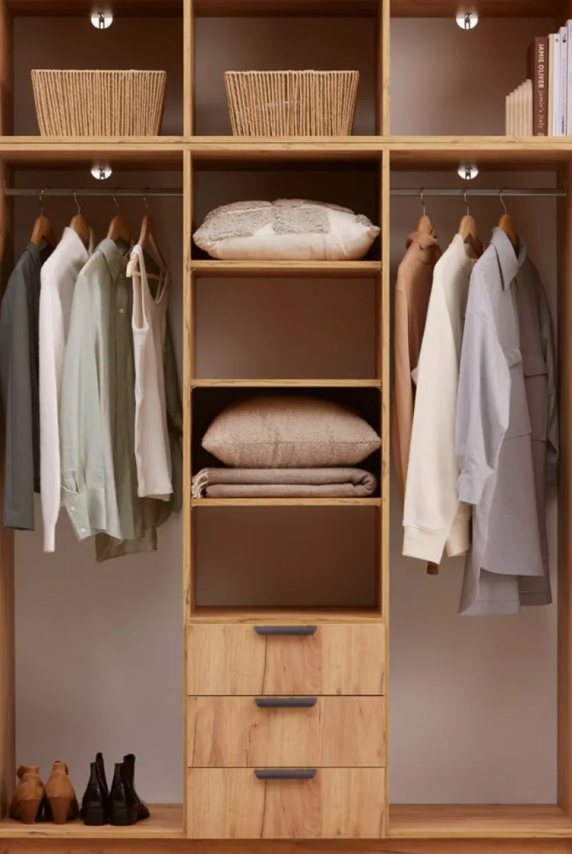 Deco fineer. Kledingkast inrichting: 4 schappen en 2 kledingroedes. B144 x H176 x D50 cm