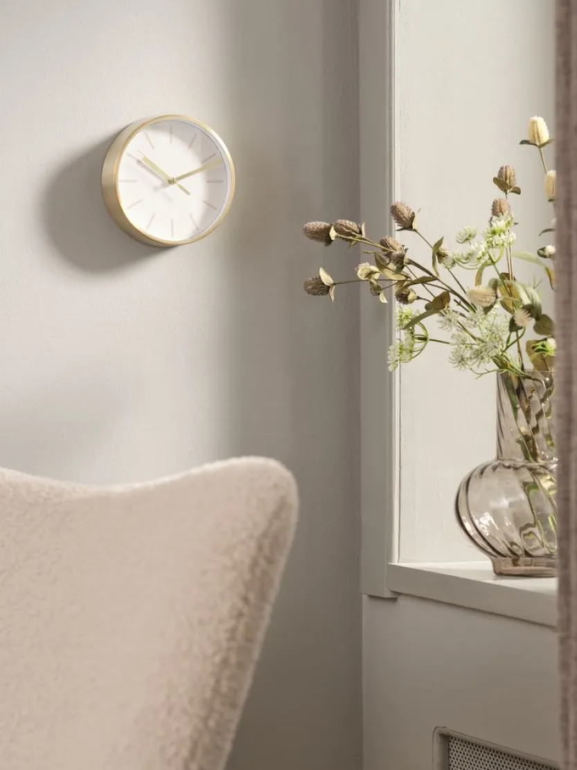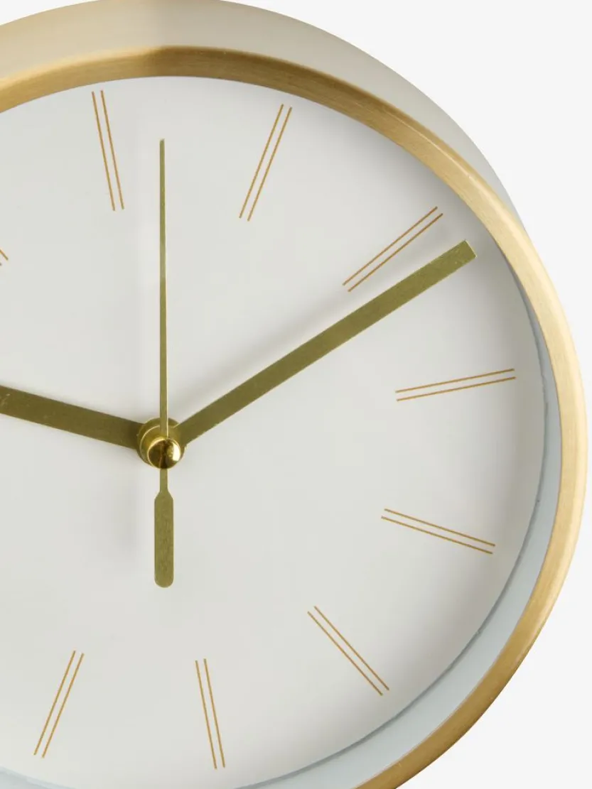 Gouden klok met een eenvoudig, minimalistisch ontwerp. Deze klok heeft een strakke witte wijzerplaat en smalle gouden wijzers, waardoor het een stijlvolle toevoeging is aan elke kamer. Werkt op 1 AA-batterij (niet inbegrepen). Ø15 cm