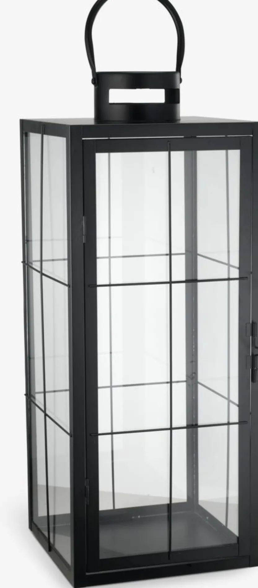 Zwarte lantaarn van staal en glas met een strak en modern ontwerp. De lantaarn heeft een stevige constructie en een handig handvat aan de bovenkant voor eenvoudig verplaatsen. De glazen panelen zorgen voor een sfeervolle uitstraling wanneer er een kaars in wordt geplaatst. Deze lantaarn is een stijlvolle toevoeging aan elk interieur. B20 x L20 x H50 cm.