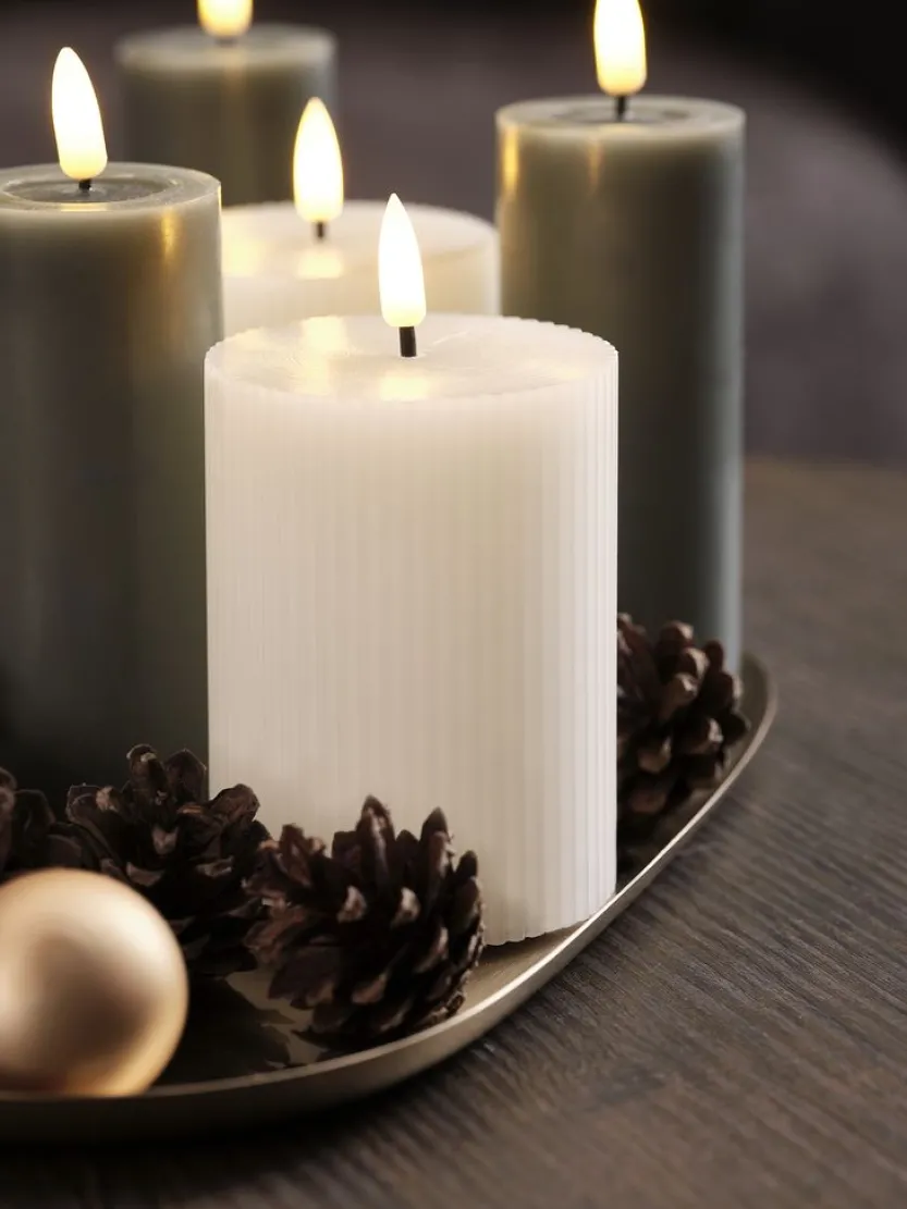 Witte led stompkaars met een geribbeld ontwerp. Deze stompkaars heeft een ingebouwde LED-lamp die zorgt voor een warme gloed met een kleur van 2300 K. De kaars bevat een timerfunctie en werkt op twee AA-batterijen (niet inbegrepen). Perfect voor binnenshuis gebruik en ideaal om een gezellige sfeer te creëren tijdens de kerstperiode. Ø8 x H13 cm.