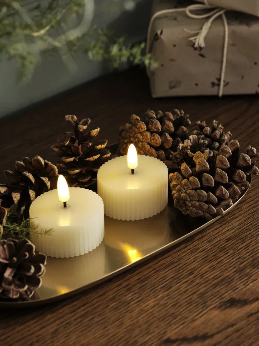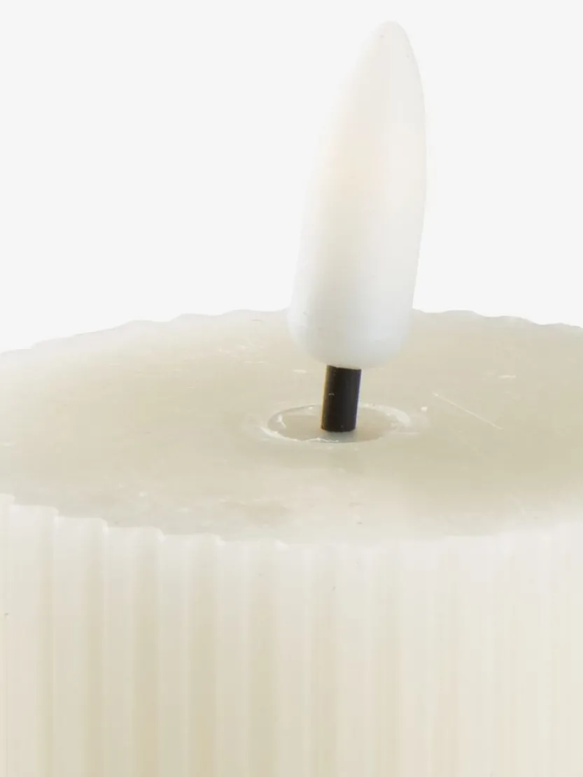 Set van 2 witte LED theelichten met een ribbelontwerp. Deze theelichten stralen een warm licht uit met een kleurtemperatuur van 2300 K, perfect voor een gezellige sfeer binnenshuis. De theelichten werken op batterijen (1x CR2032, niet inbegrepen) en zijn ideaal voor kerstdecoraties of dagelijks gebruik. 6×6 cm.
