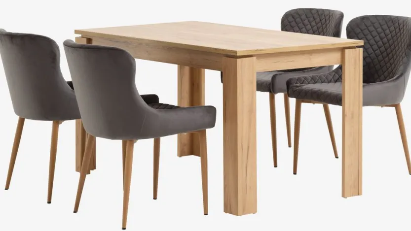 LINTRUP L140 tafel eiken + 4 PEBRINGE stoelen fluweel grijs
