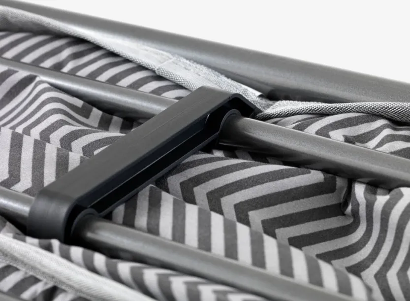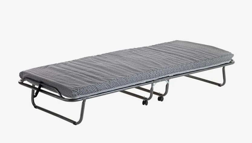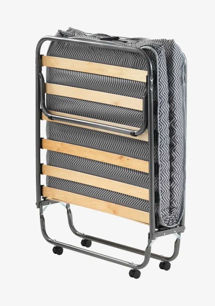 Vouwbed met een 7 cm dik matras van polyetherschuim. Grijs stalen frame met houten latten en wielen. B80 x L190 x H33 cm