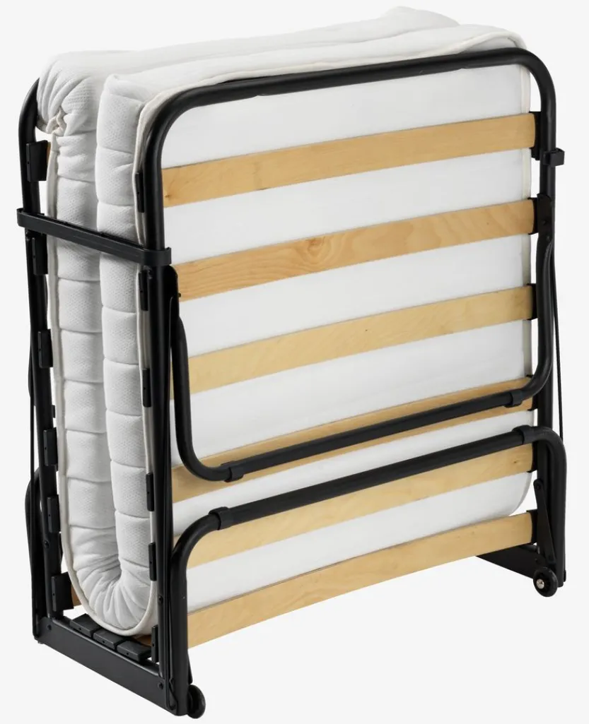 Staal. 11 cm dik matras met drukverlagend traagschuim en polyurethaanschuim. Met latten. Inklapbaar. B80 x L193 x H45 cm