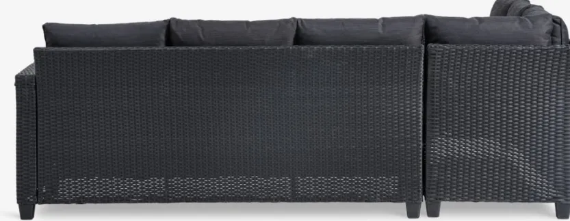 Tafel: Staal, kunsthout en polyrotan. B74 x L144 x H67 cm. 6-zitsbank: Staal en polyrotan. Kan niet gespiegeld worden. Incl. luxe kussens met duurzame, structuurgeweven hoes.