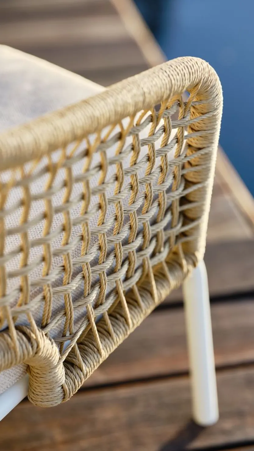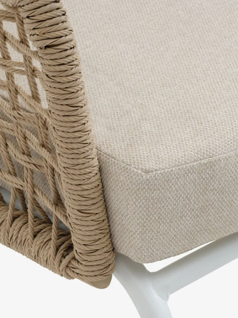 Tafel: aluminium en vezelcement. B70 x L110 x H42 cm. 3-zitsbank en stoel: aluminium en polyrotan. Incl. luxe kussens met sneldrogende, structuur-geweven hoes. De hoes is aan de binnenzijde voorzien van een waterdichte coating, waardoor er geen water in het kussen kan dringen.