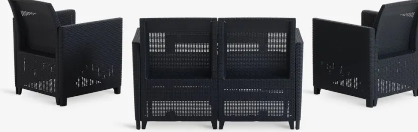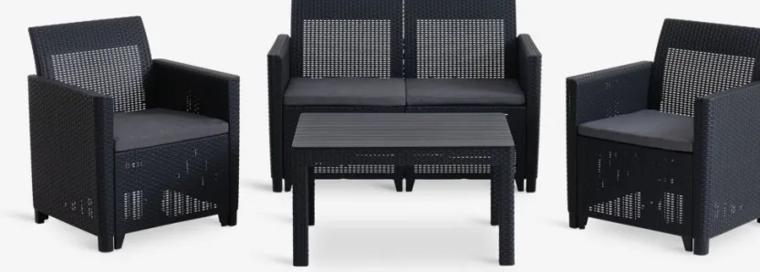 4-zits loungeset. Tafel: UV-beschermd kunststof (75% gerecycled). B78 x L59 x H43 cm. 2-zitsbank en stoel: UV-beschermd kunststof (75% gerecycled). Incl. kussens.