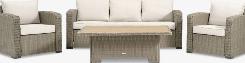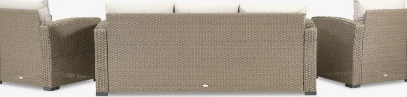 Tafel: Aluminium, kunsthout en polyrotan. In hoogte verstelbaar. B86 x L136 x H44/68 cm. 3-zitsbank en stoel: Aluminium en polyrotan. Incl. luxe kussens met duurzame, structuurgeweven hoes.