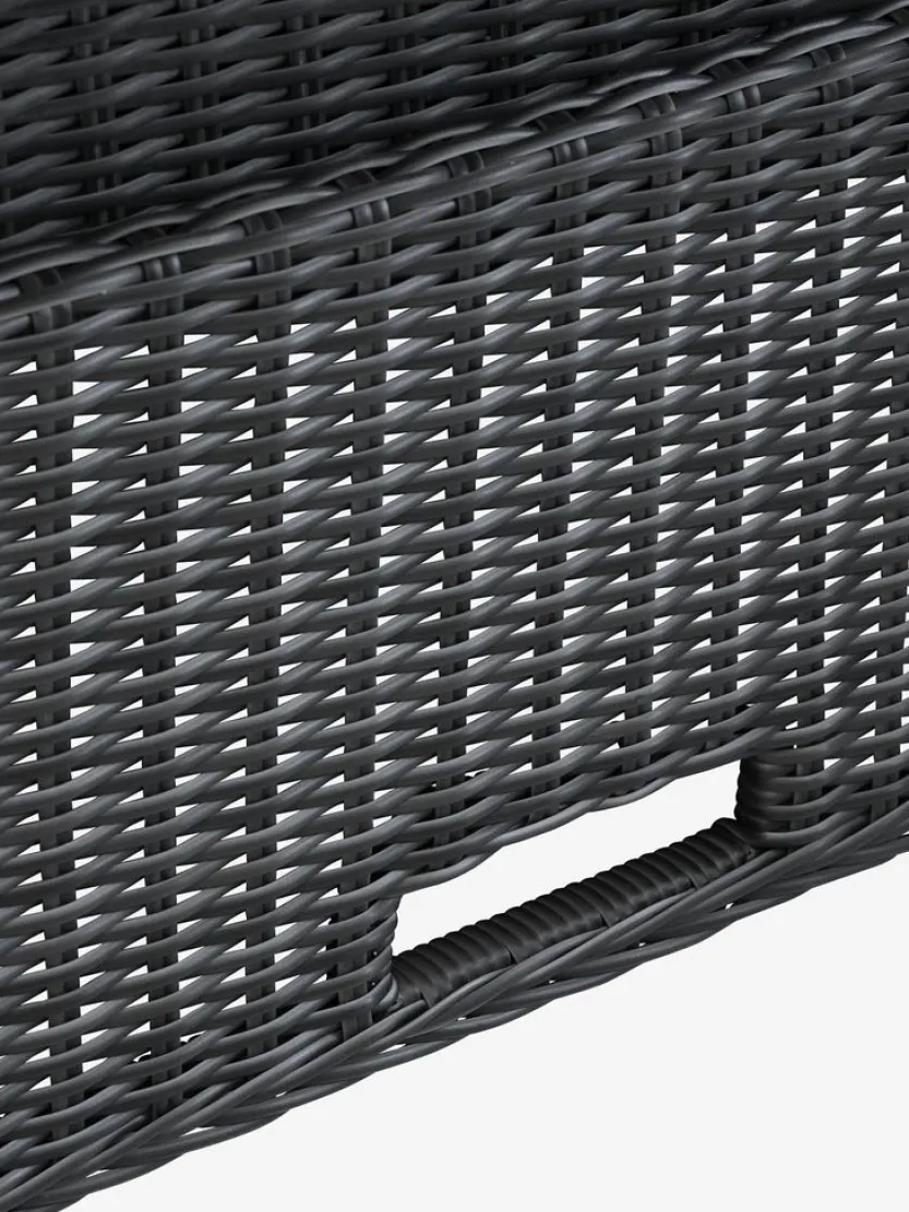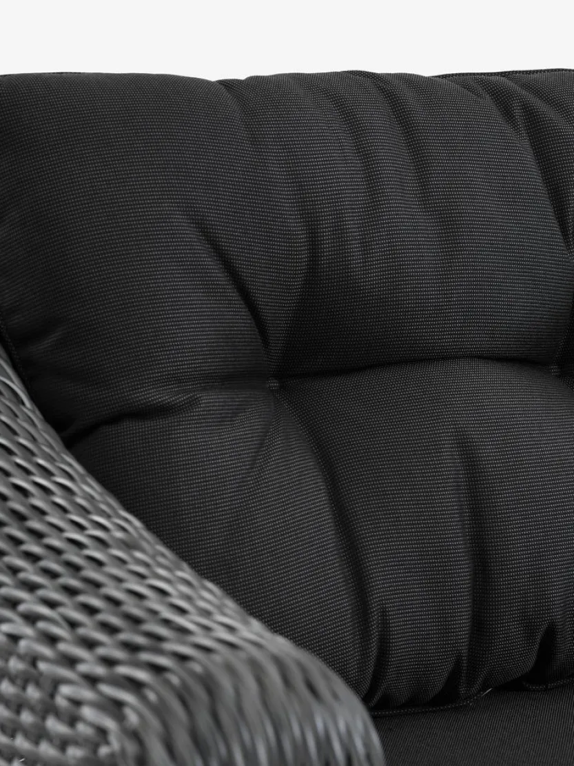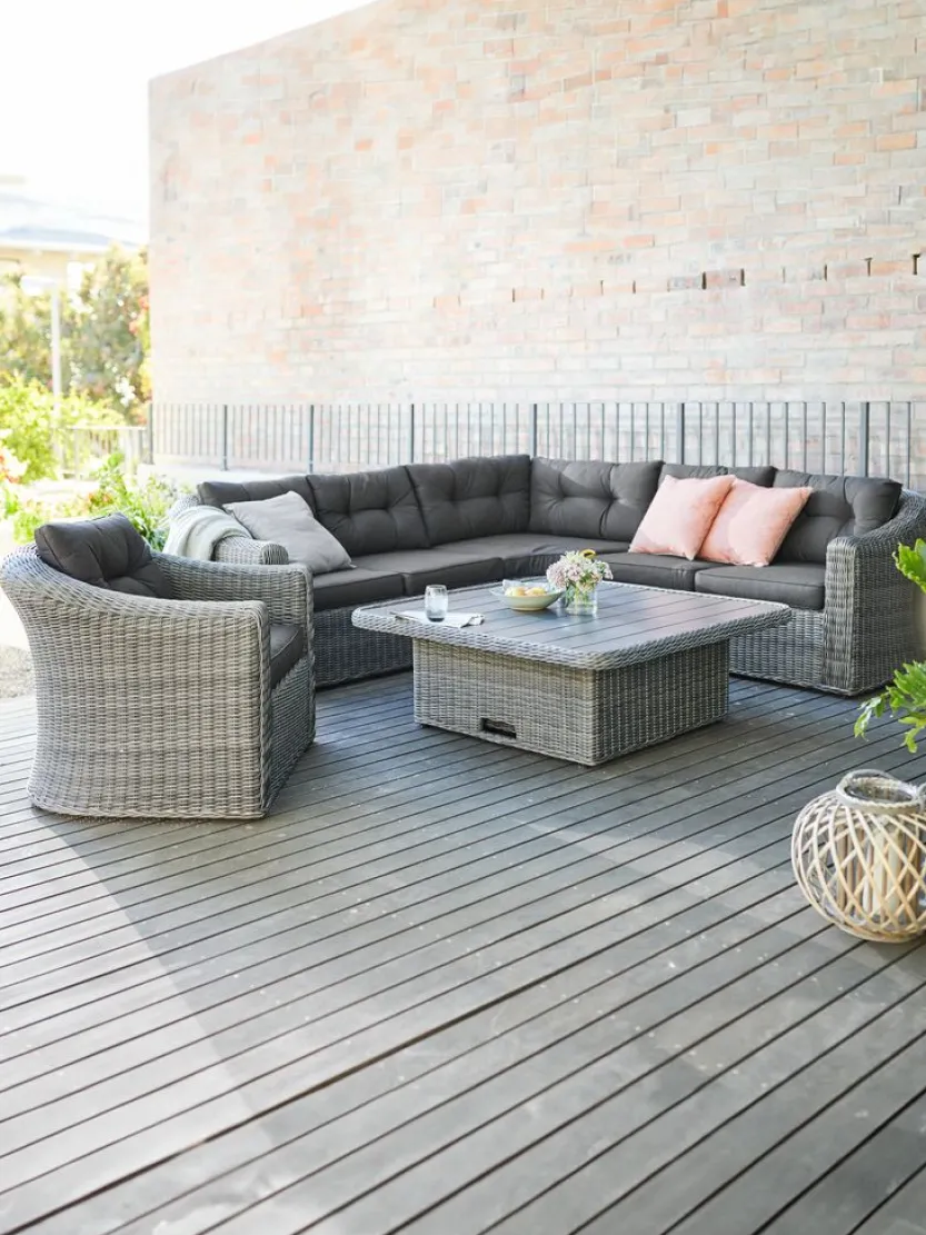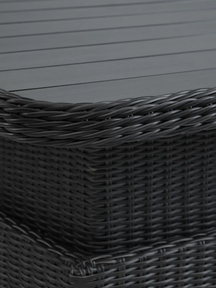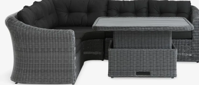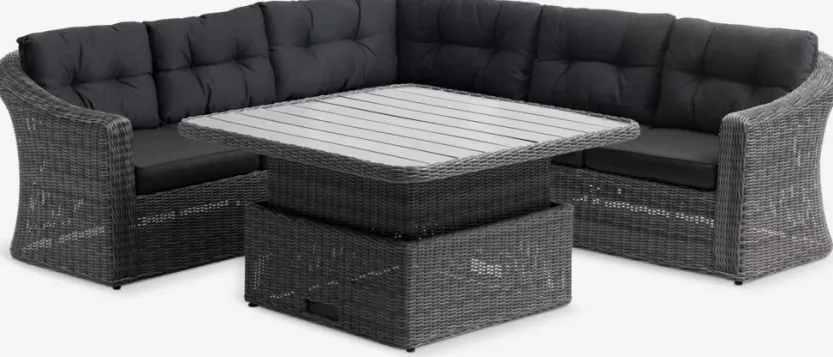 5-zits loungeset. Tafel: Aluminium, DURAWOOD® samengesteld hout en polyrotan. DURAWOOD® is een duurzaam samengesteld materiaal gemaakt van FSC® hardhout vezels en kunststof. In hoogte verstelbaar. B121 x L121 x H44/67 cm. 5-zitsbank: Aluminium en polyrotan. Incl. luxe kussens met een duurzaam, structuurgeweven hoes.