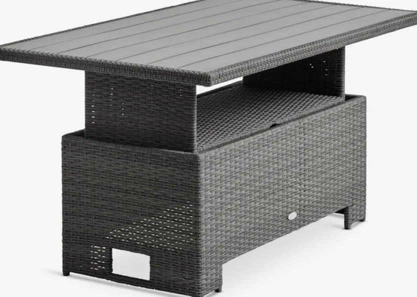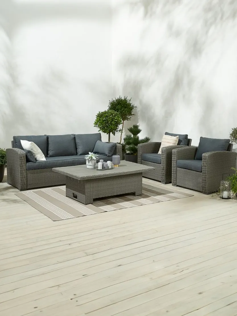 5-zits loungeset. Tafel: Aluminium, kunsthout en polyrotan. In hoogte verstelbaar. B85 x L134 x H45/68 cm. 3-zitsbank en stoel: aluminium en polyrotan. Incl. luxe kussens met een duurzaam, structuurgeweven hoes.