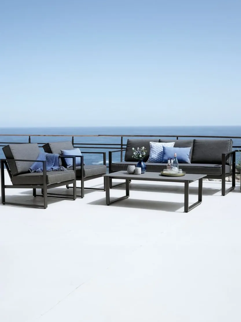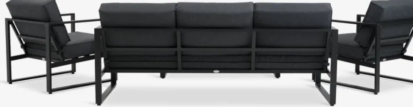 Tafel: aluminium en vezelcement. B64 x L129 x H40 cm. 3-zitsbank en stoelen: aluminium. Incl. luxe kussens met een duurzaam, structuurgeweven hoes.