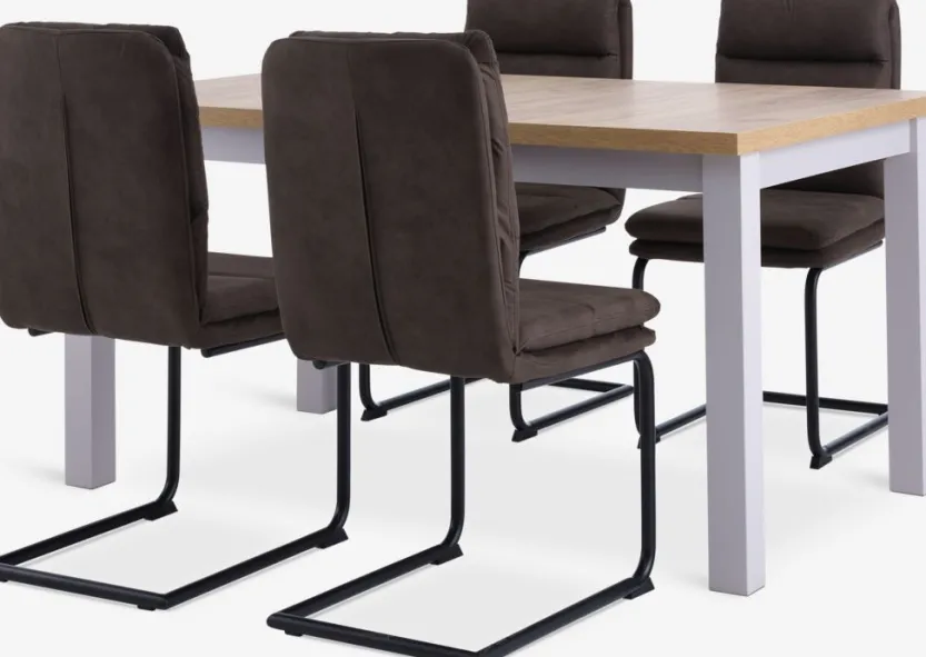 Tafel: Deco fineer. Incl. 1 verlengblad, dat onder het tafelblad kan worden opgeborgen. B90 x L150/193 x H75 cm. Stoel: Stof en staal.