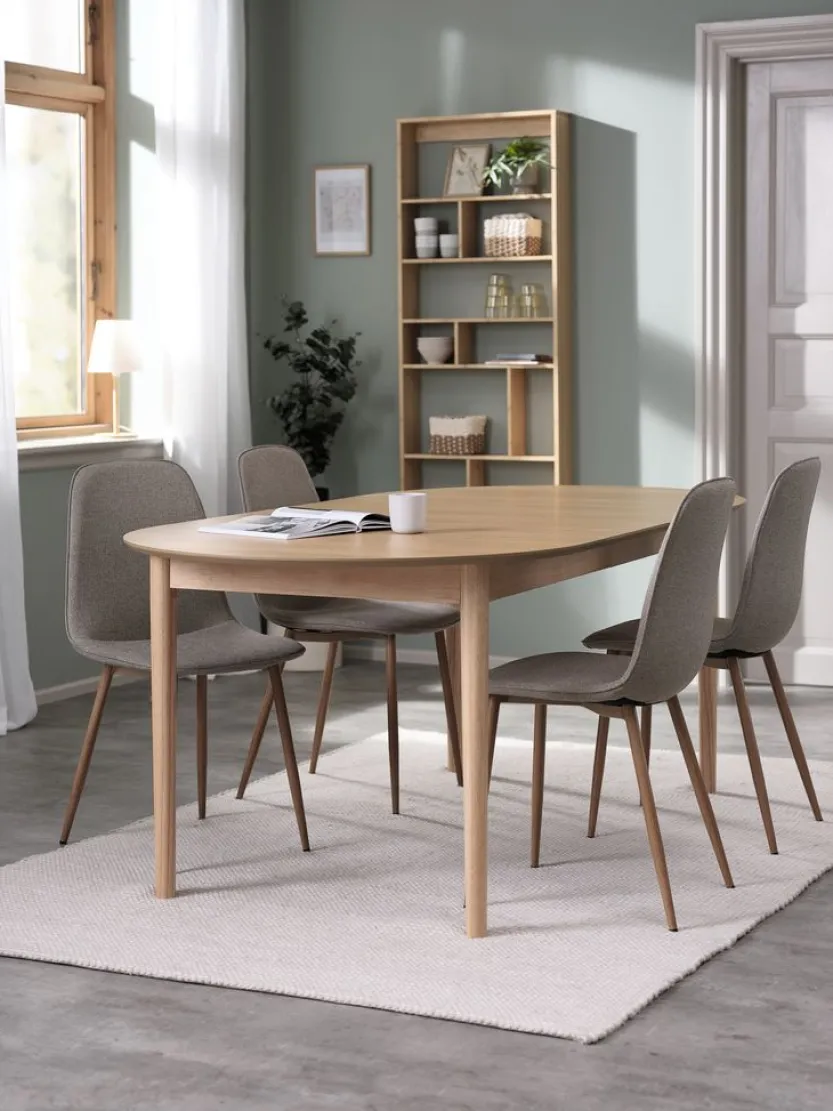 Tafel: Massief hout en eiken fineer. Incl. 2 verlengbladen die onder het tafelblad kunnen worden opgeborgen. B100 x L200/240/280 x H75 cm. Stoel: Stof en staal.