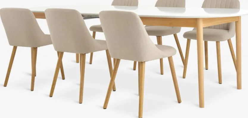 Tafel: Massief hout en MDF. Incl. 2 verlengbladen die onder het tafelblad kunnen worden opgeborgen. B100 x L200/240/280 x H75 cm. Stoel: Stof en massief hout.
