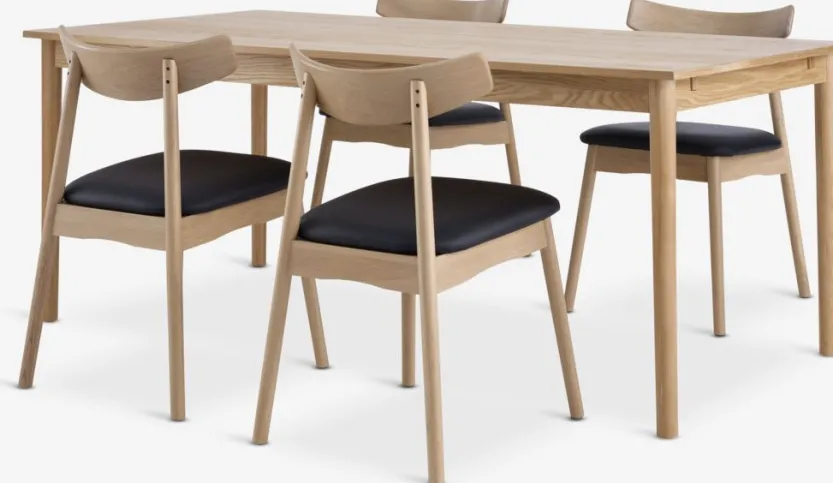 Tafel: Massief eiken en eiken fineer. Incl. 2 verlengbladen. B95 x L190/235/280 x H75 cm. Stoel: Kunstleer en massief eiken.
