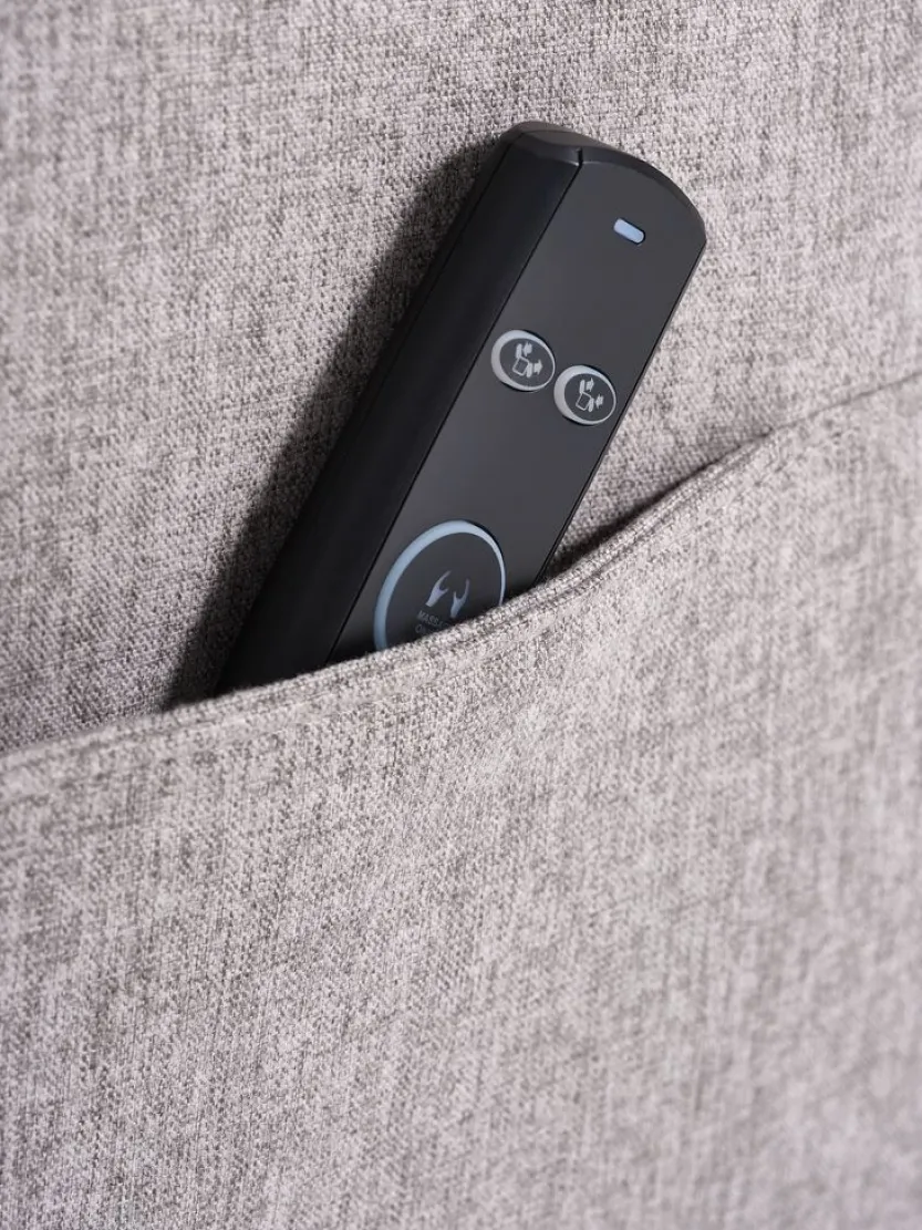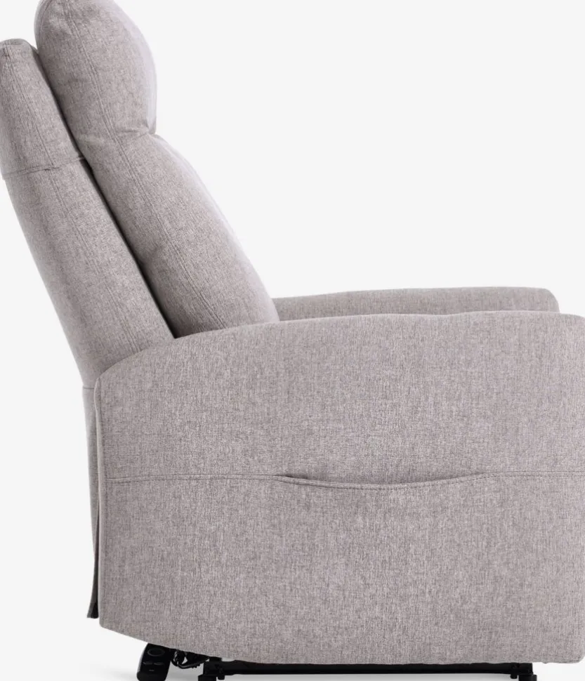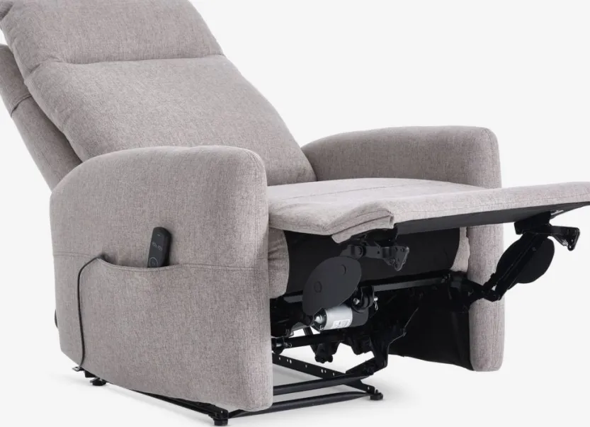 Stof. De stoel biedt massage met timer. Met traploos kantelmechanisme en ingebouwde beensteun. B78 x H111 x D97 cm