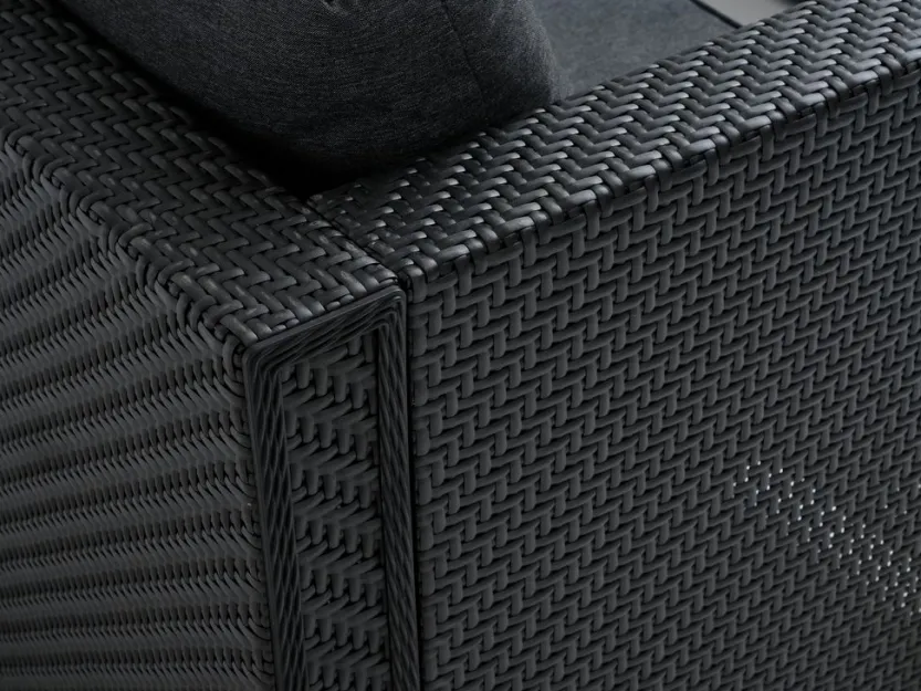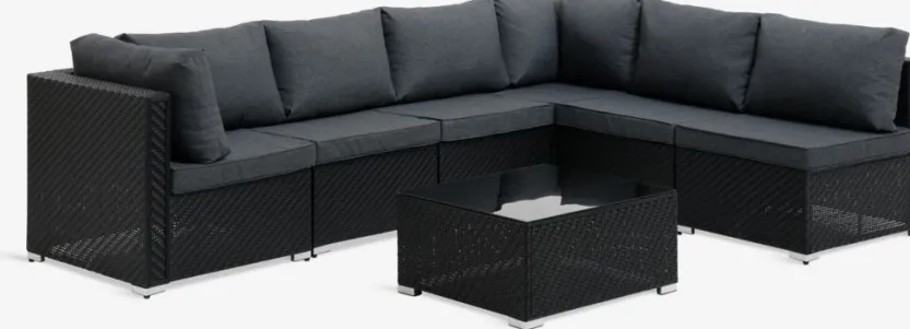 Modulaire loungeset met 6 zitplaatsen, inclusief 7 modules die kunnen worden aangepast aan je buitenruimte. 1 tafel: Staal en gehard glas. B60 x L68 x H32 cm. 4 middel en 2 hoek/eindmodules: Staal en polyrotan. Incl. kwaliteitskussens met duurzame hoes.